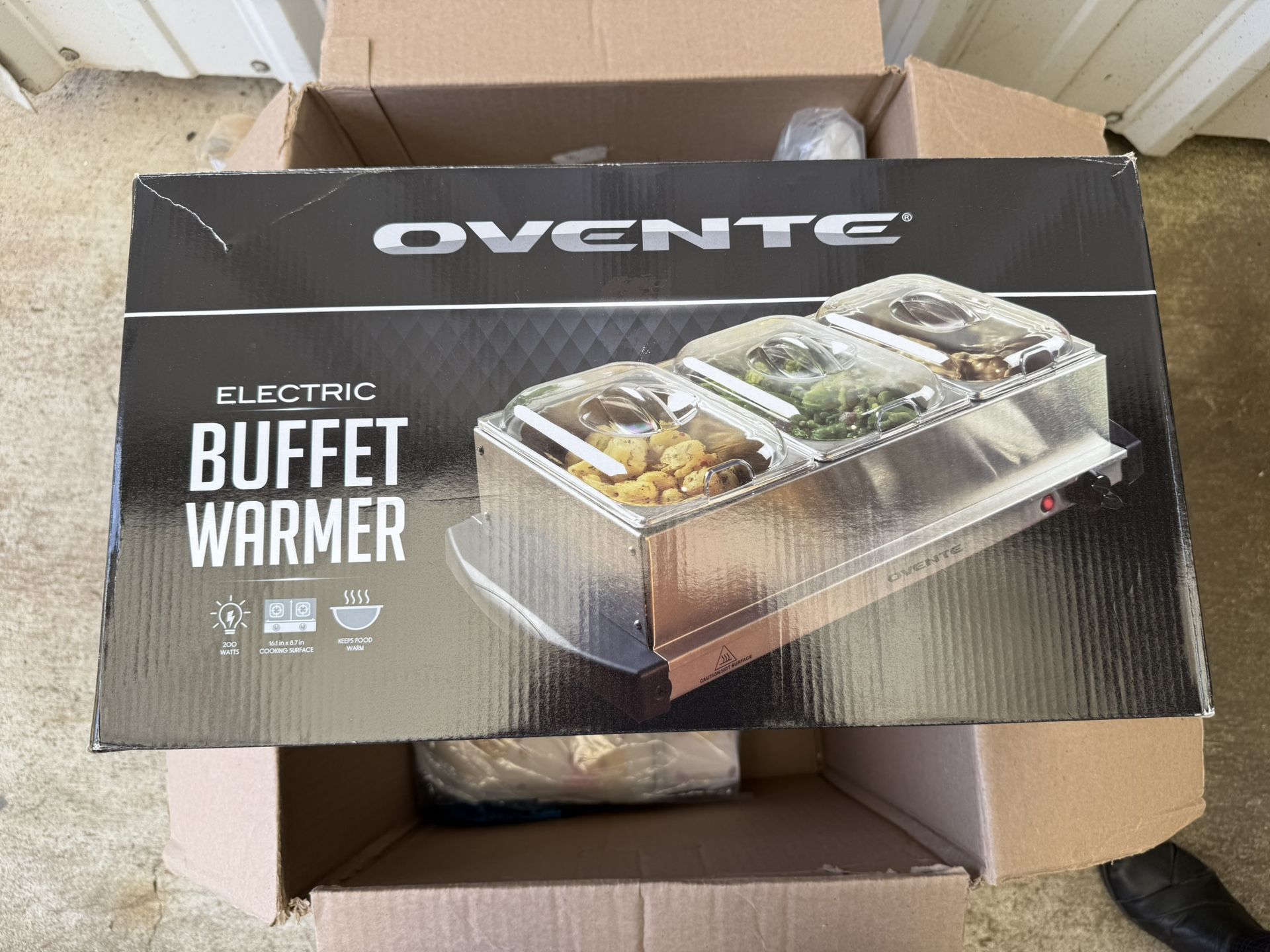 It features multiple stainless steel trays (the specific model in the image has three 1.5-quart pans) and a warming tray that keeps food hot without drying it out or burning the bottom. includes an adjustable temperature control knob to maintain the desired warmth for hours.