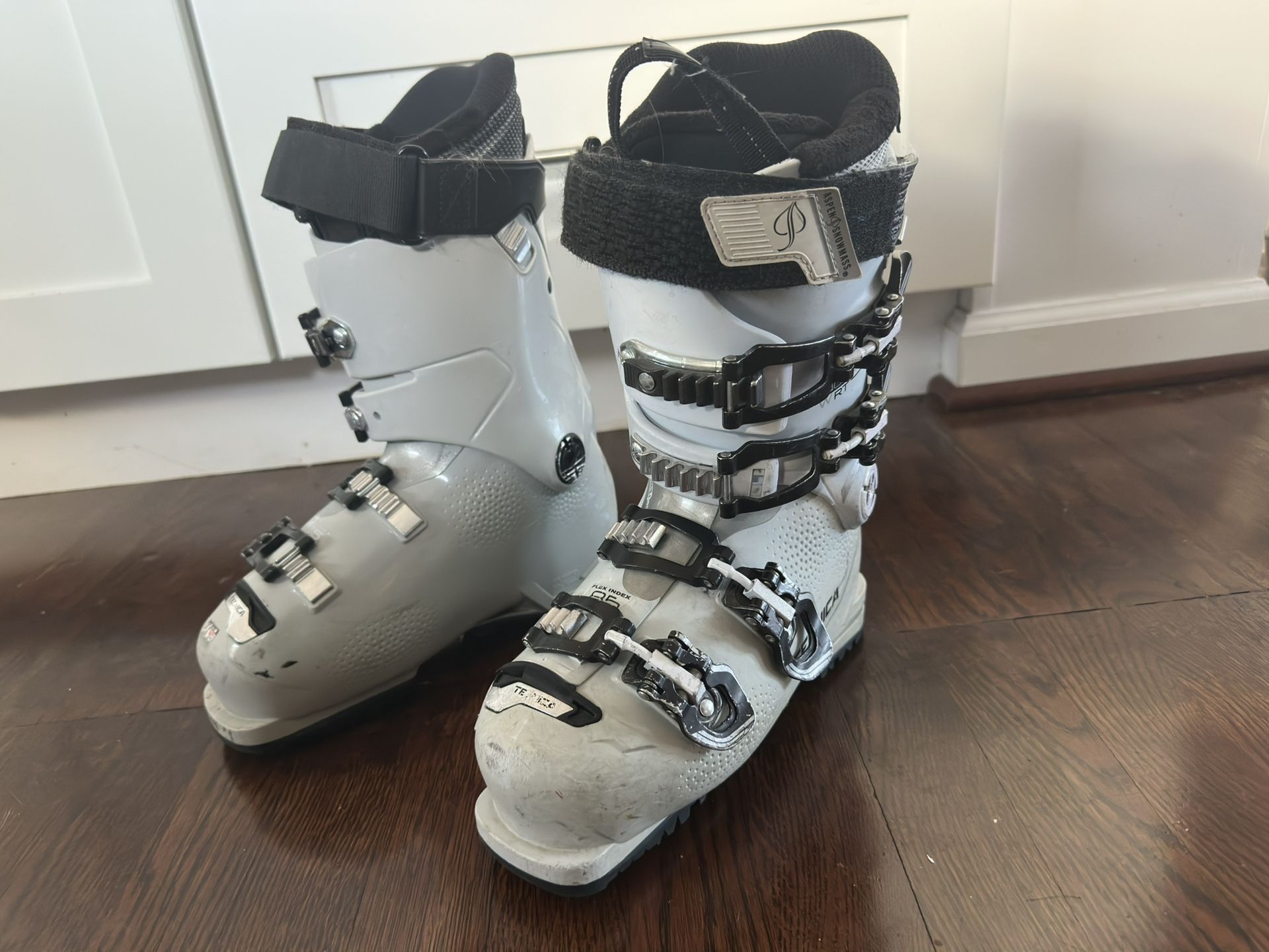 Bought these boots for my mom last winter but she recently got a ankle injury that prevents her for skiing any more. Still in very good condition with a few scratches here and there. Goes for around $200-400 depending on the models but I think they are all pretty similar. Size: Mondo 23.5/Womens 6.5/Mens 5.5