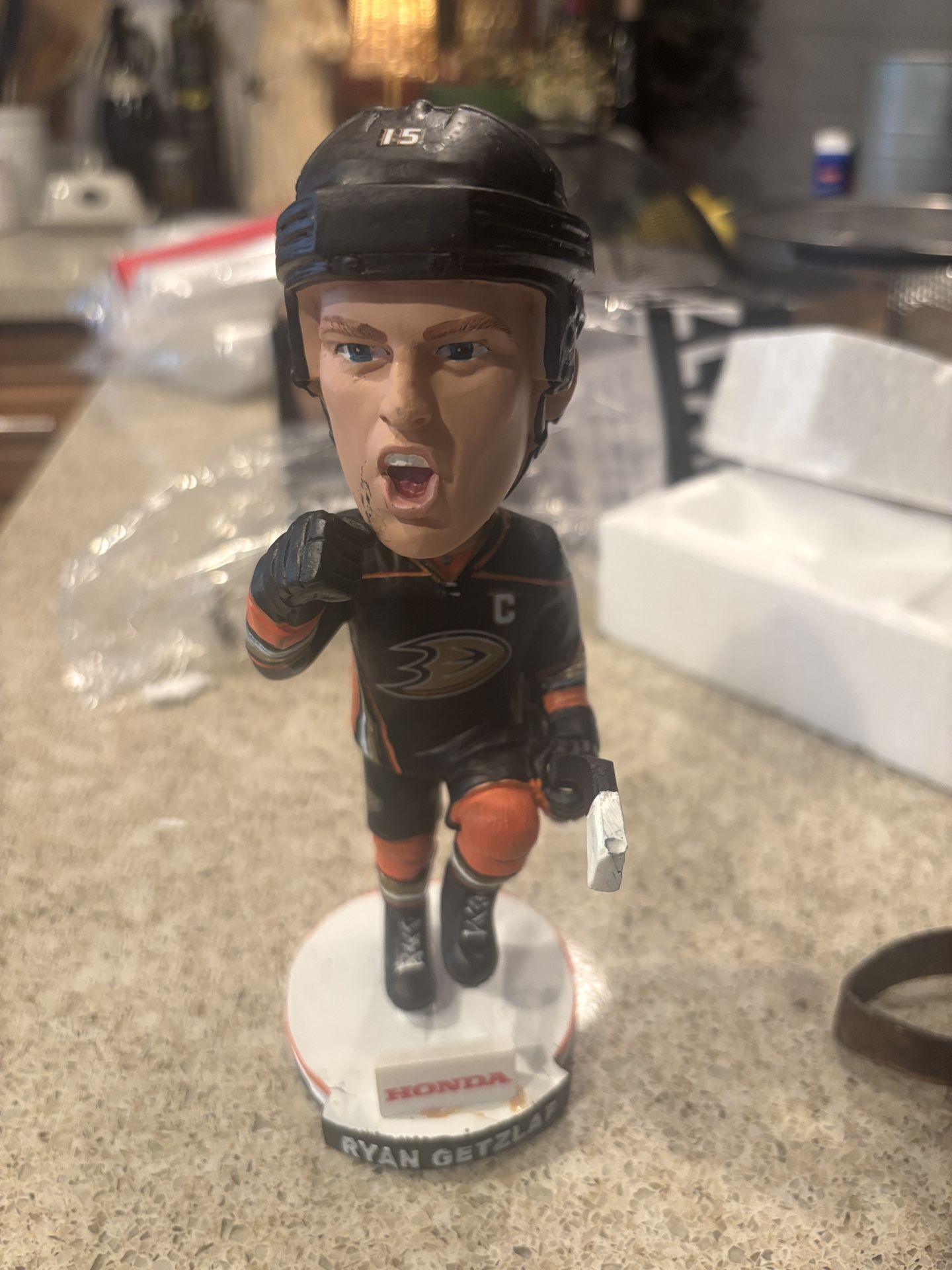 in the box, figurine is wrapped in plastic with hockey stick. Box is a little worn and Styrofoam inside broke off a little at the top when trying to take it out of its container. Not sure if this was from 2016 or 2019 The paint from its hand left marks on the face as reflected in the pictures