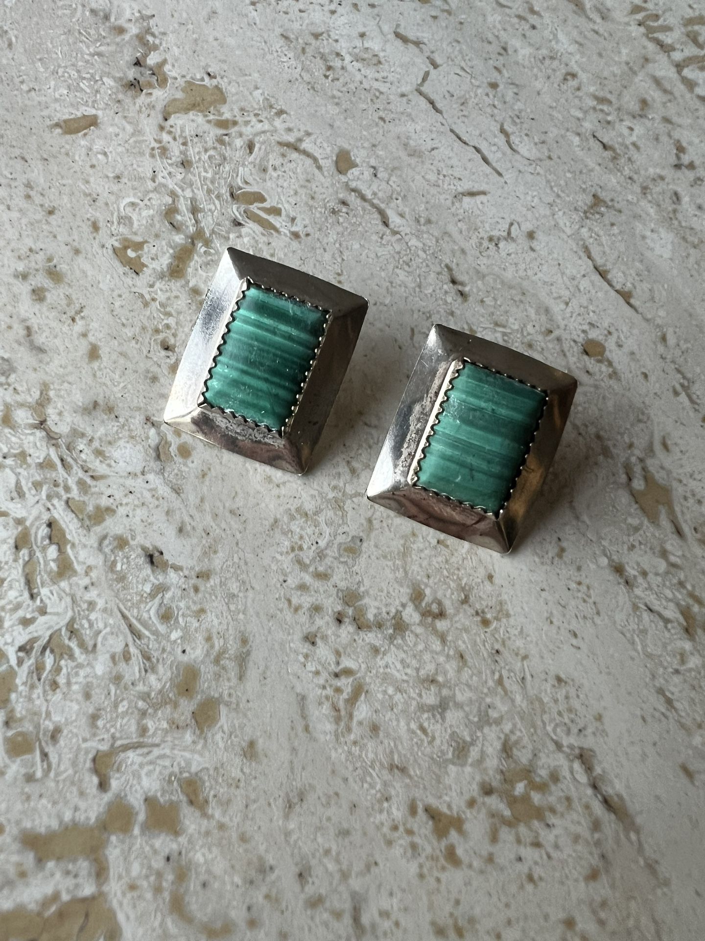 Sterling Sliver Vintage Malachite Rectangular Stud Post Earrings