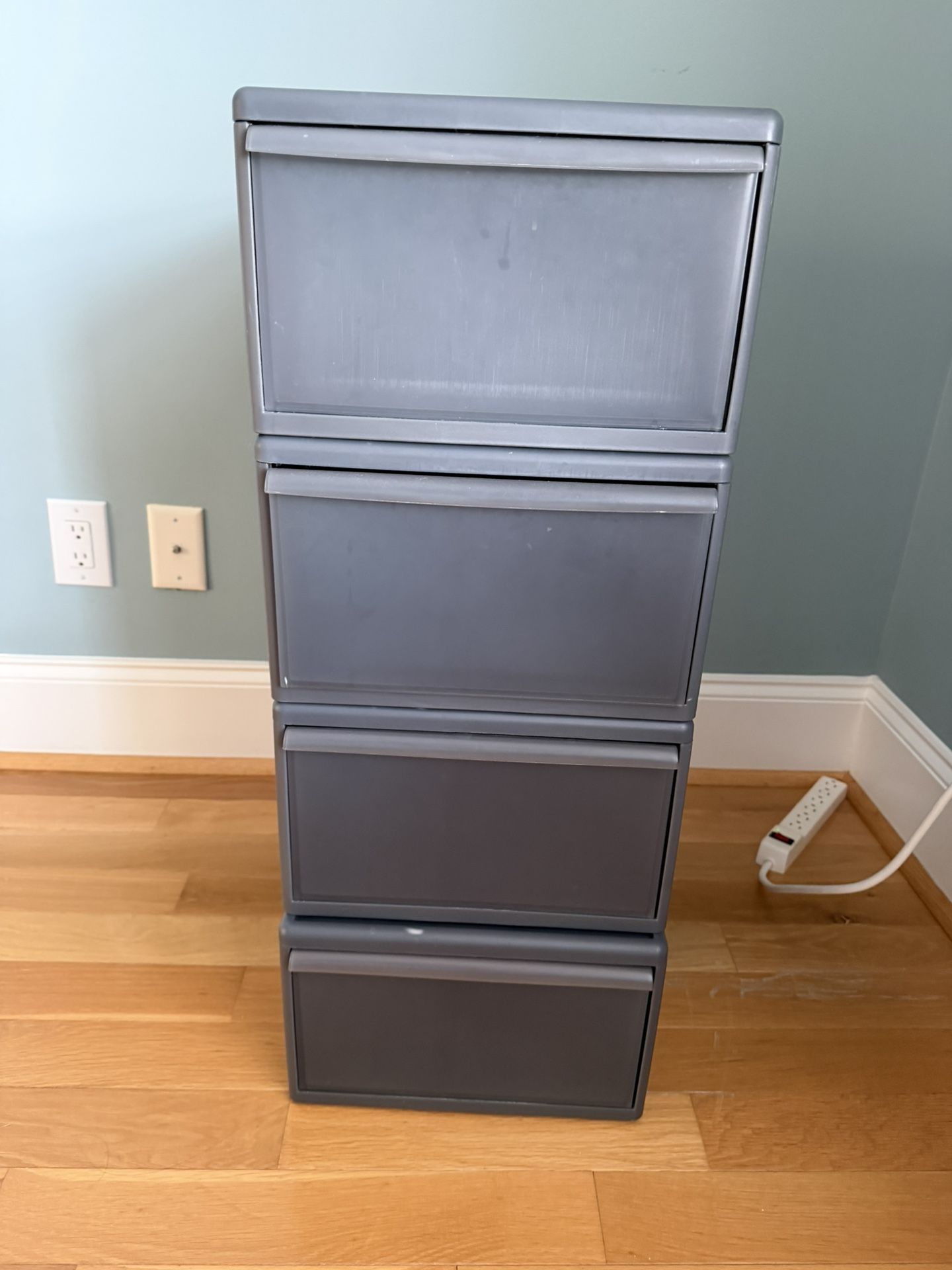 Grey stackable plastic drawers, barely used. Retails for $100 at container store. Perfect for storing toys, clothes, accessories, and more.