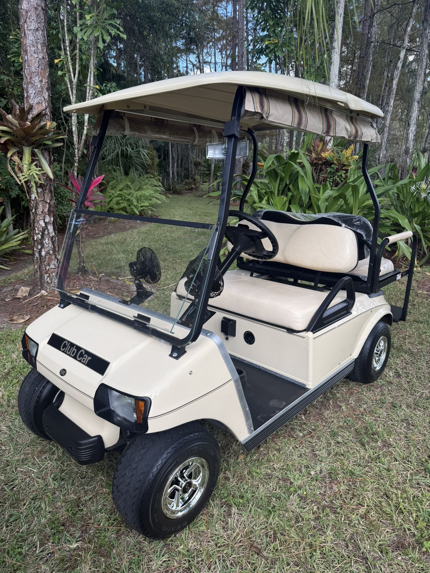 Hello up for sale is my 48 Volt Club Car Golf Cart! The cart is ready to go with a list of things on it! NEW SS WHEEL COVERS RAIN CURTAINS WINDSHIELD NEW REAR SEAT KIT REAR VIEW MIRROR (2) FANS HEADLIGHTS AND TAILLIGHTS CHARGER This cart is ready to go and would be perfect for playing a round of 18 holes or cruising the neighborhood! I CAN DELIVER ANYWHERE IN FLORIDA FOR A FEE! Any questions feel free to ask! Asking $2975!