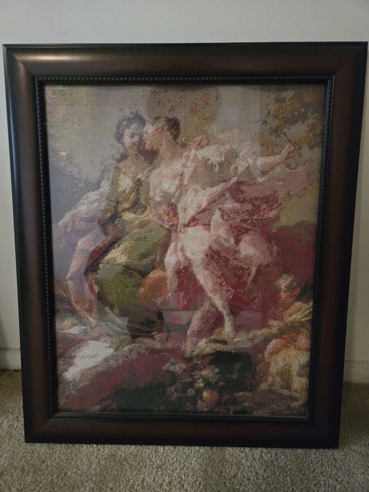 Beautiful, completed Renaissance-style angelic cross stitch art framed in glass. 19x23 inches. Pickup in West Hollywood.