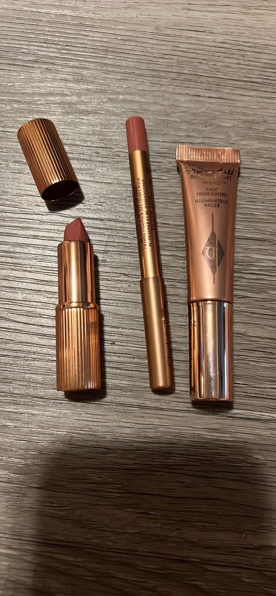 Lip liner, lipstick, and liquid highlighter
