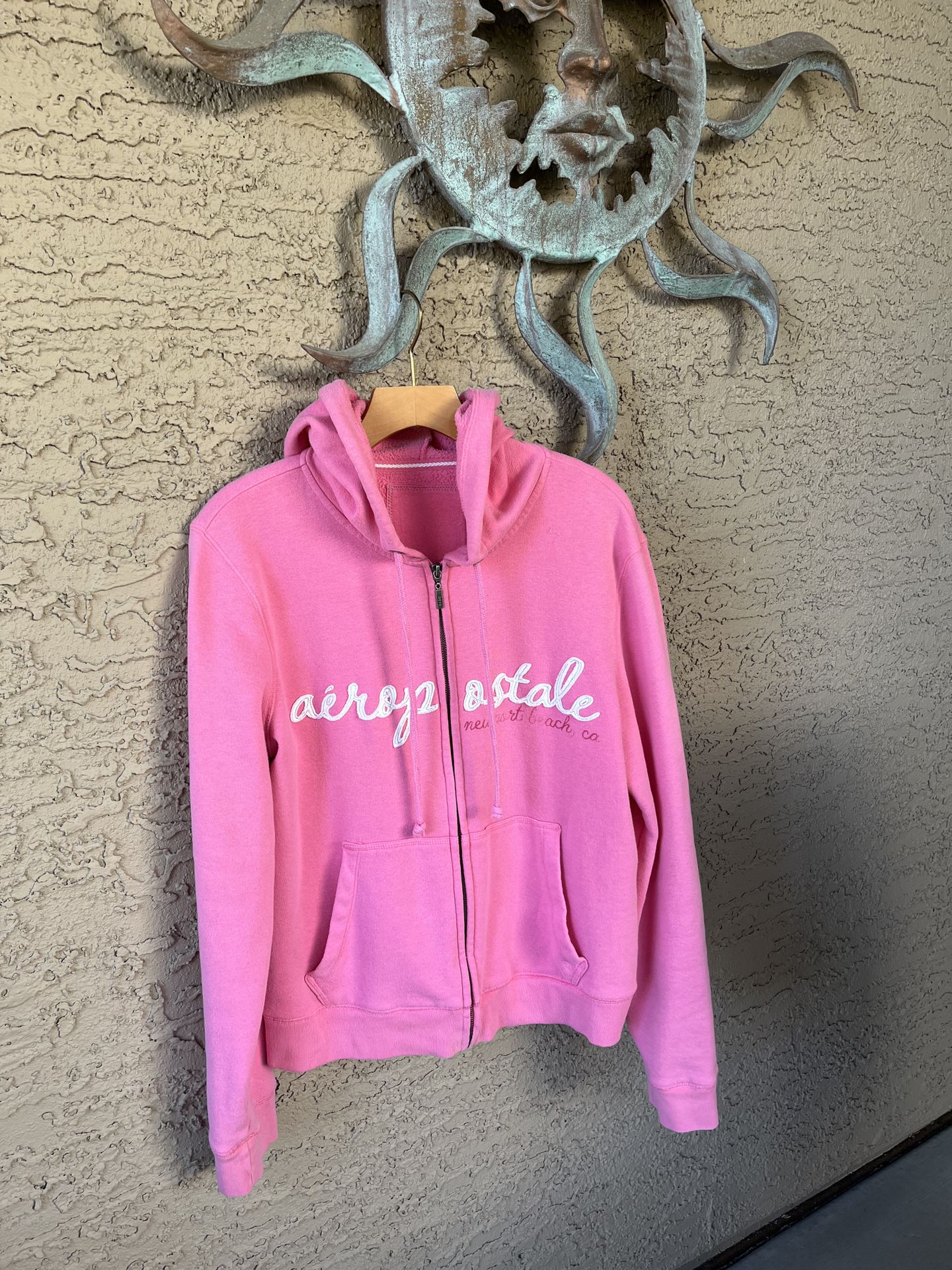 Bright and effortlessly casual, this pre-owned Aeropostale Newport Beach full-zip hoodie is the perfect everyday layer. Made in a vibrant pink hue, it features a soft fleece interior, with an adjustable drawstring hood. The front showcases the signature aéropostale script logo with “Newport Beach, CA” embroidery detail, giving it that laid-back California vibe. Ribbed cuffs and hem provide a flattering, structured fit. Great for lounging, workouts, or casual weekend wear.