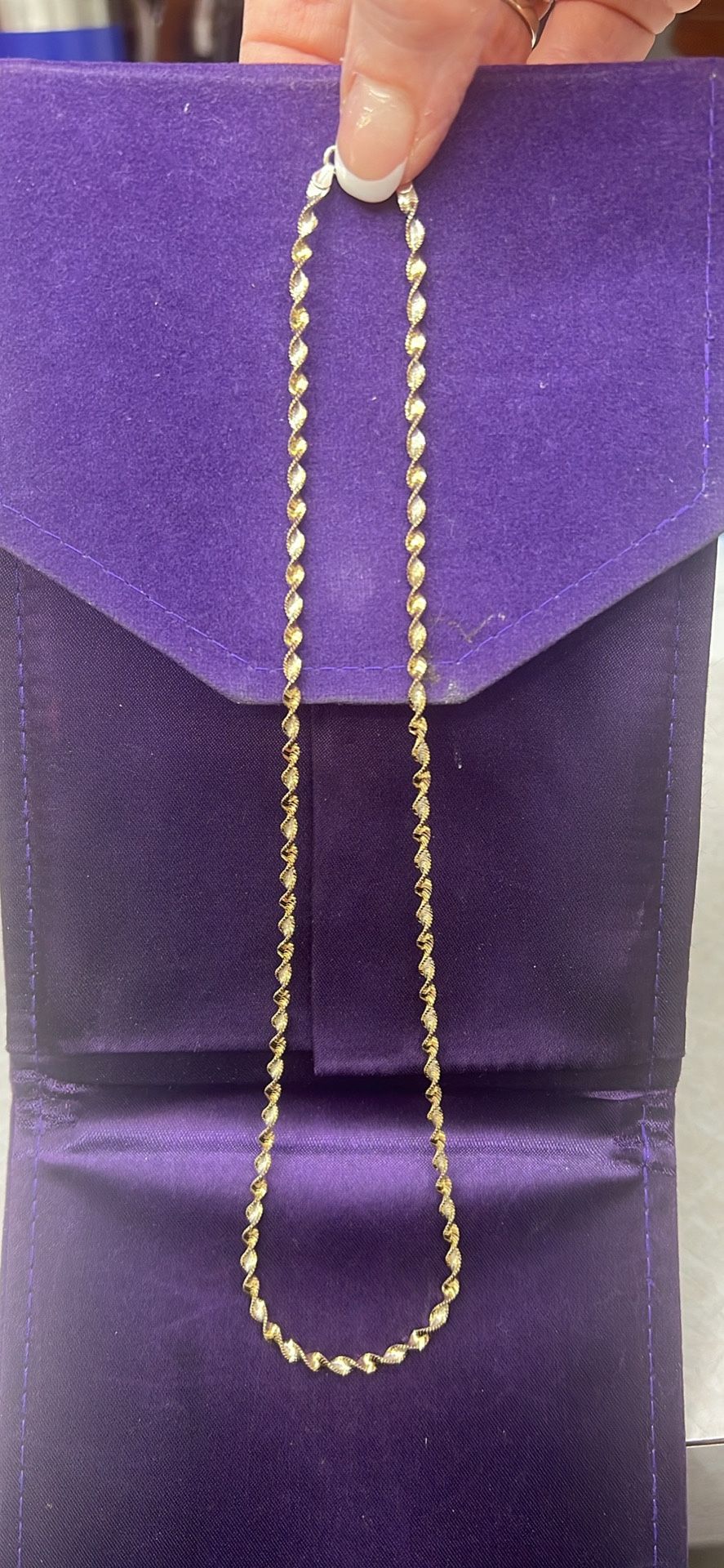 This is a beautiful chain that is sterling silver 925. It’s about 17 and three-quarter inches long. It was purchased new from jewelry TV and never worn is very pretty located in Dover cash only local pick up. It is not real gold. It is sterling silver.
