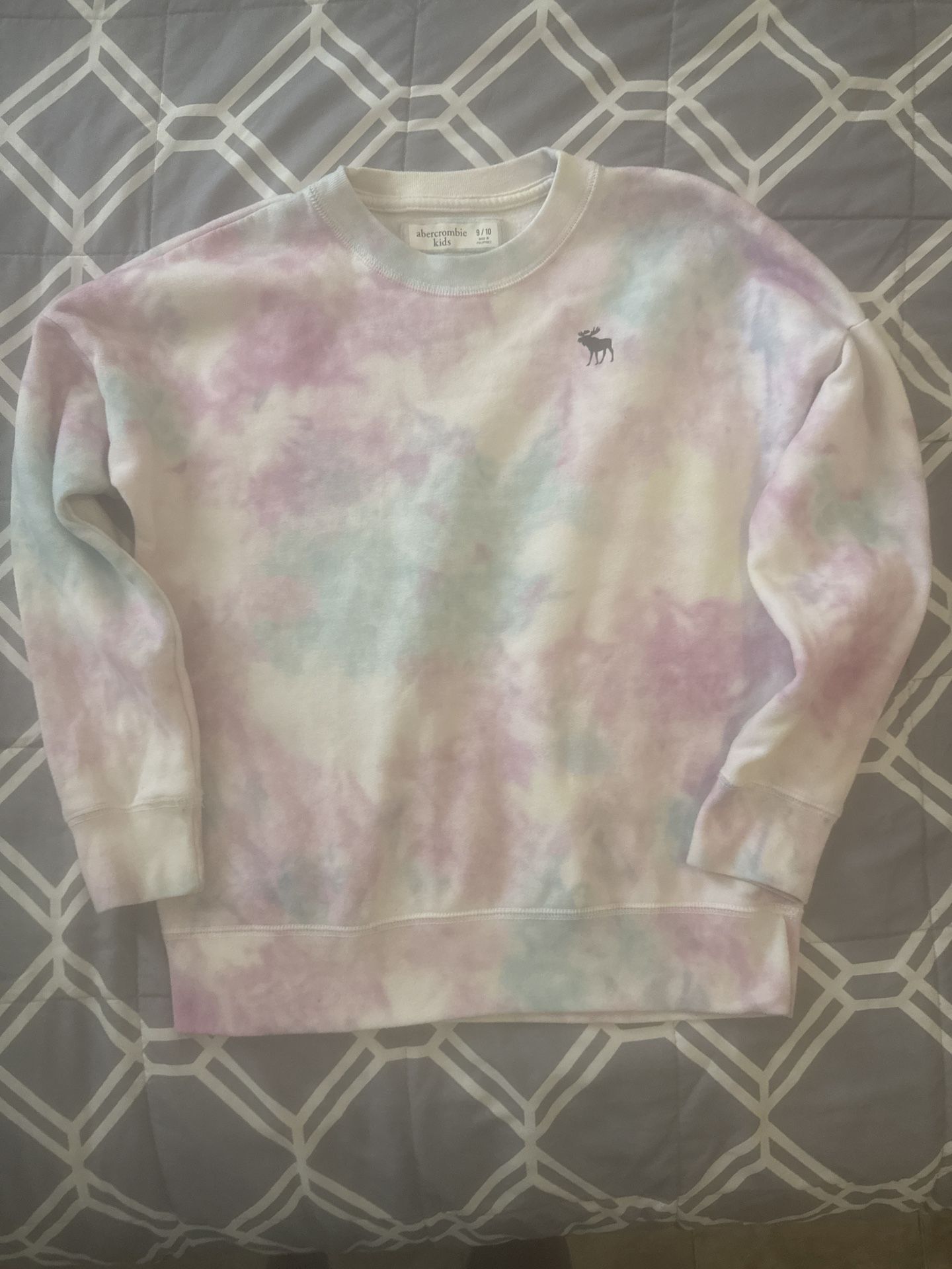 Selling a cute Abercrombie Kids tie-dye sweatshirt! It's a size 9/10. The sweatshirt has a fun pastel tie-dye pattern with the Abercrombie logo. Perfect for a kiddo!