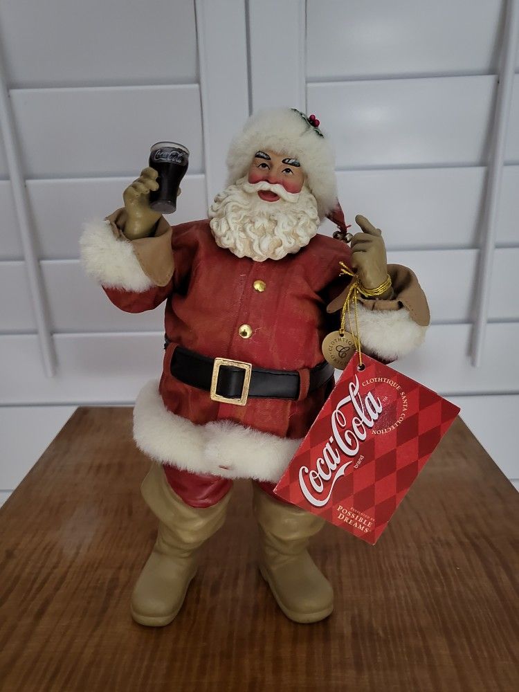 This 1997 Coca-Cola Santa figurine is from the Clothtique Santa Collection, presented by Possible Dreams. Santa stands approximately 12 inches tall. This unique figurine will be sold with its original box.