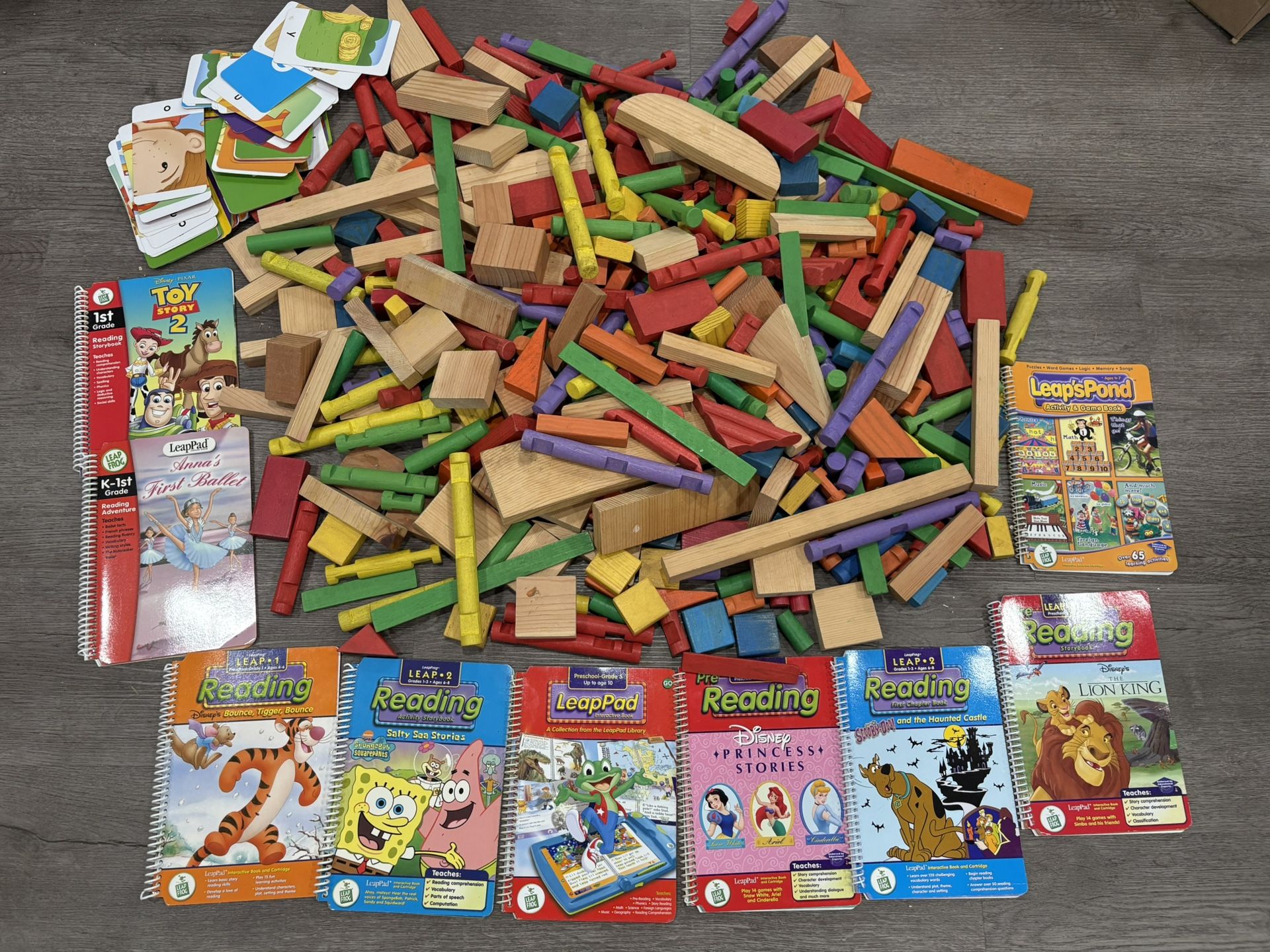 Multiple learning materials A lot of wood blocks Letter wood blocks Puzzles Learning cards No missing parts Everything in the pictures included