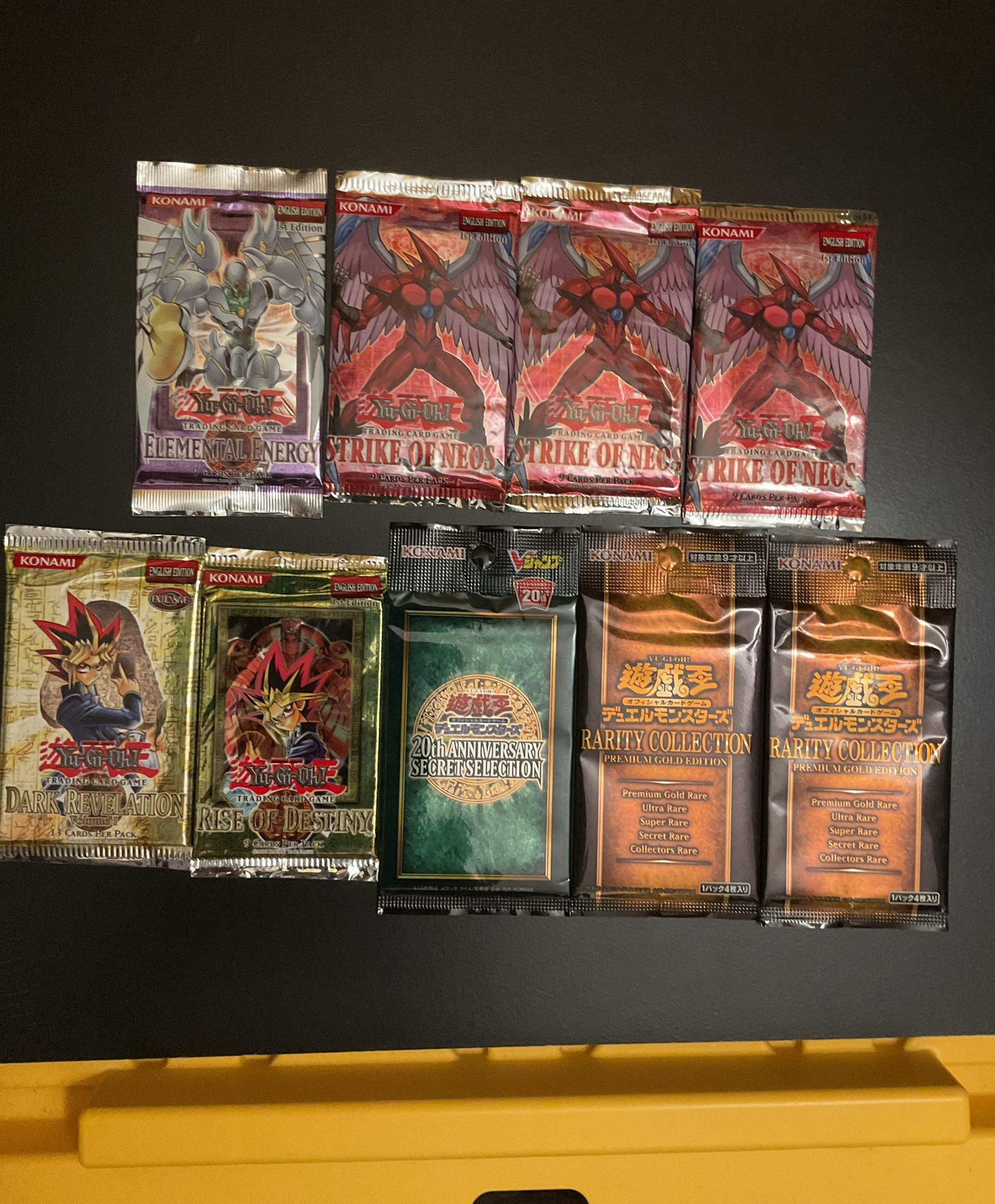 9 sealed Yugioh booster packs total -3 Strike of Neos 1st edition $45 each -1 Elemental Energy 1st edition $70 -1 Dark Revelation Volume 1 $30 -1 Rise of Destiny 1st edition $20 -2 Rarity Collection Premium gold edition $12 each -1 20th anniversary secret selection $50 All packs for $200 priced to sell