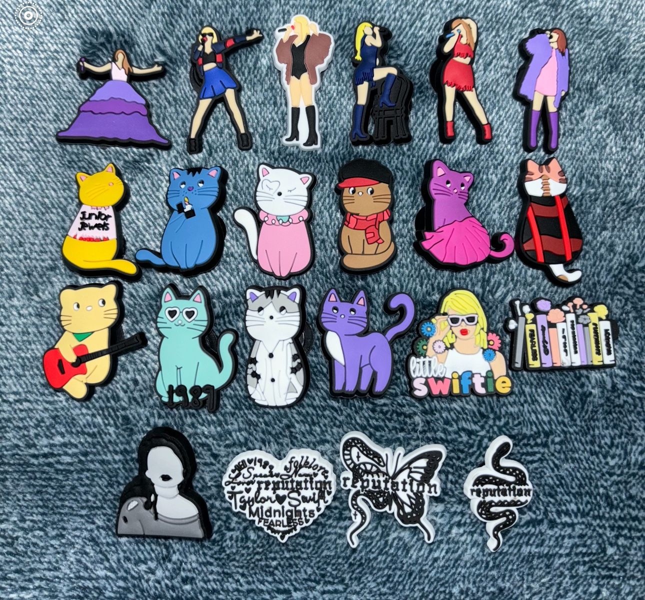 Taylor swift croc charms 🫶🏼 $20 for the bundle if picked up $2 each or $1each when you purchase 20+ pieces Mix and match Reputation Cats Swiftie Eras Debut