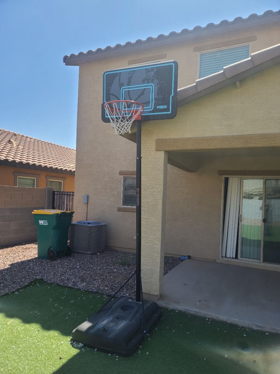 Basketball hoop practically new. Pickup only. Portable base and a telescoping adjustment from 7.5 to 10 feet, this hoop can be moved to a yard or driveway for whoever is playing. The 44 inch backboard is made of UV-protected polyethylene.