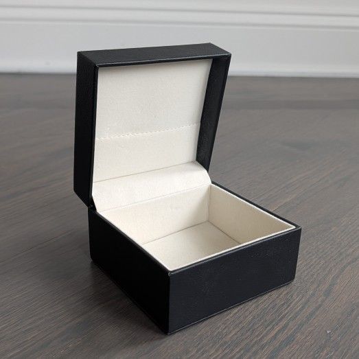 High-quality, professional watch presentation box perfect for storage, travel, or gifting. The exterior features a sleek black faux-leather finish accented with sharp white contrast stitching. Size: Large 4.5" x 4.5" square base; 3" height. Interior: Soft cream/tan protective lining with a matching plush watch pillow. Capacity: Oversized design easily fits larger men's watches (invicta, divers, etc.) or chunky bracelets. Condition: Like new. The hinge is tight and the interior is spotless. A - 004