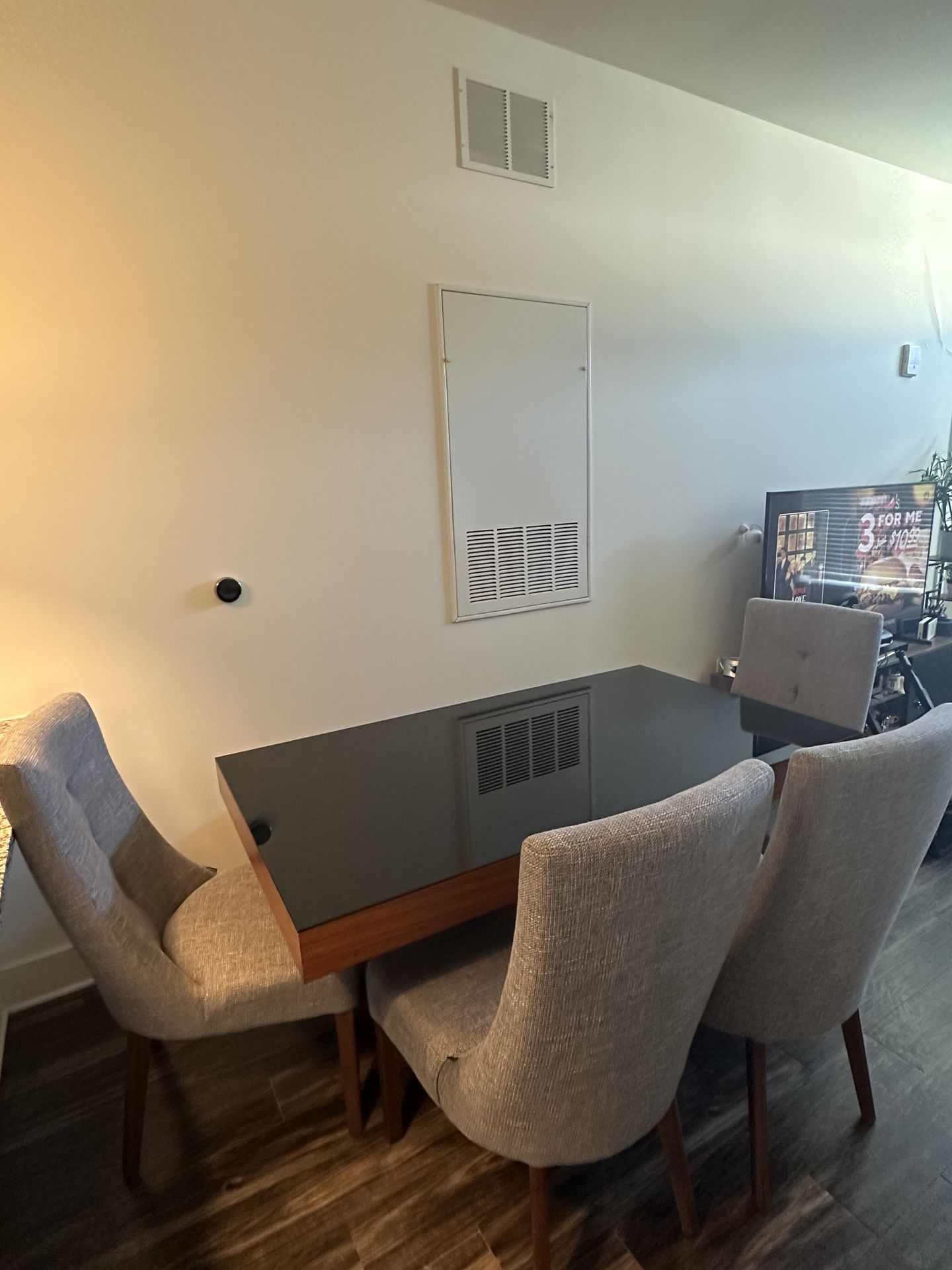 Dining room table set for 6 people Table made of black glass and wood, gray chairs. In excellent condition. Negotiable price.
