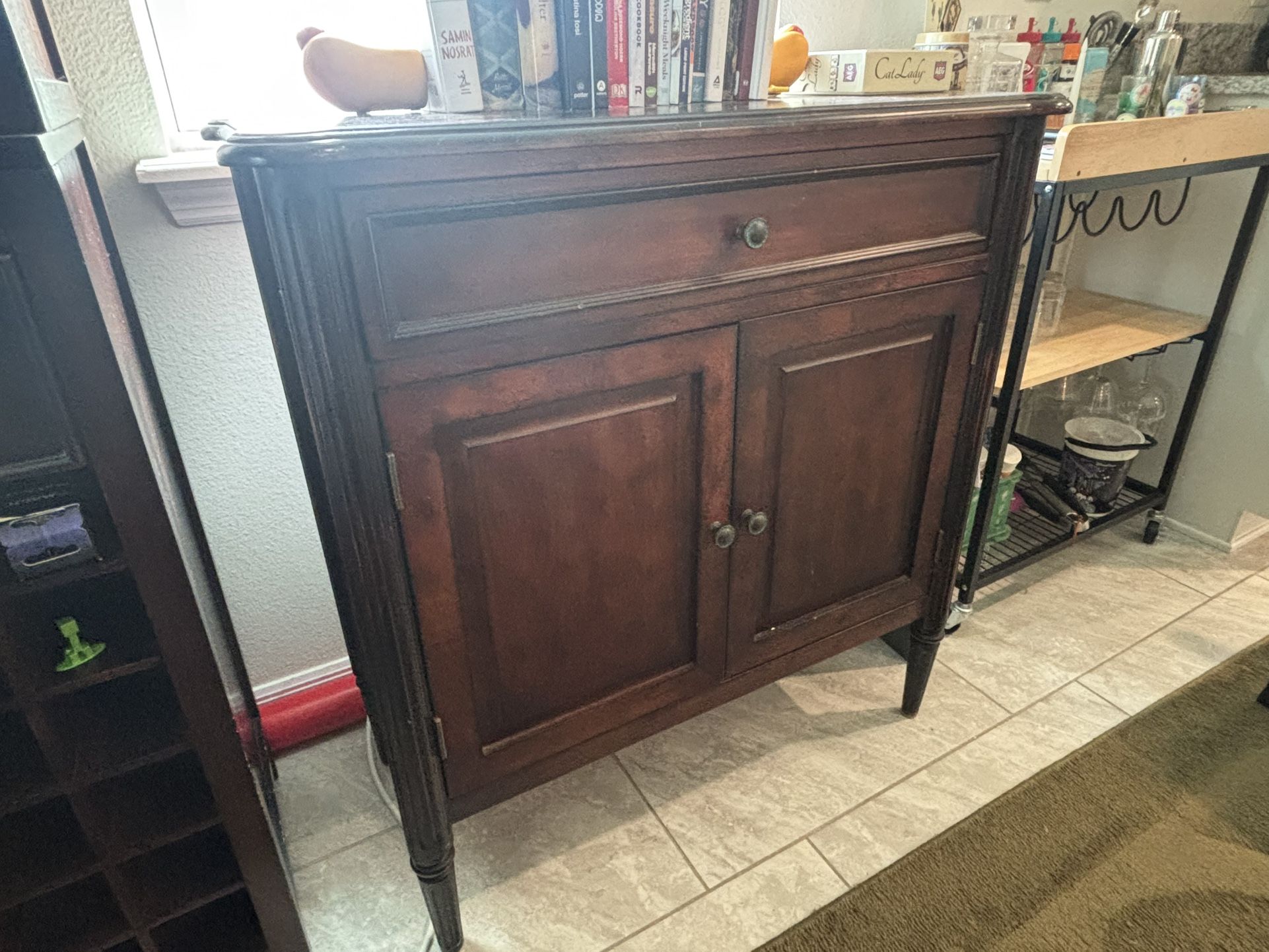 Real wood, been in the family a long time. Used for a variety of purposes over the years, it’s bound to last another 20 years. Normal wear. Unit is very heavy, pickup only.