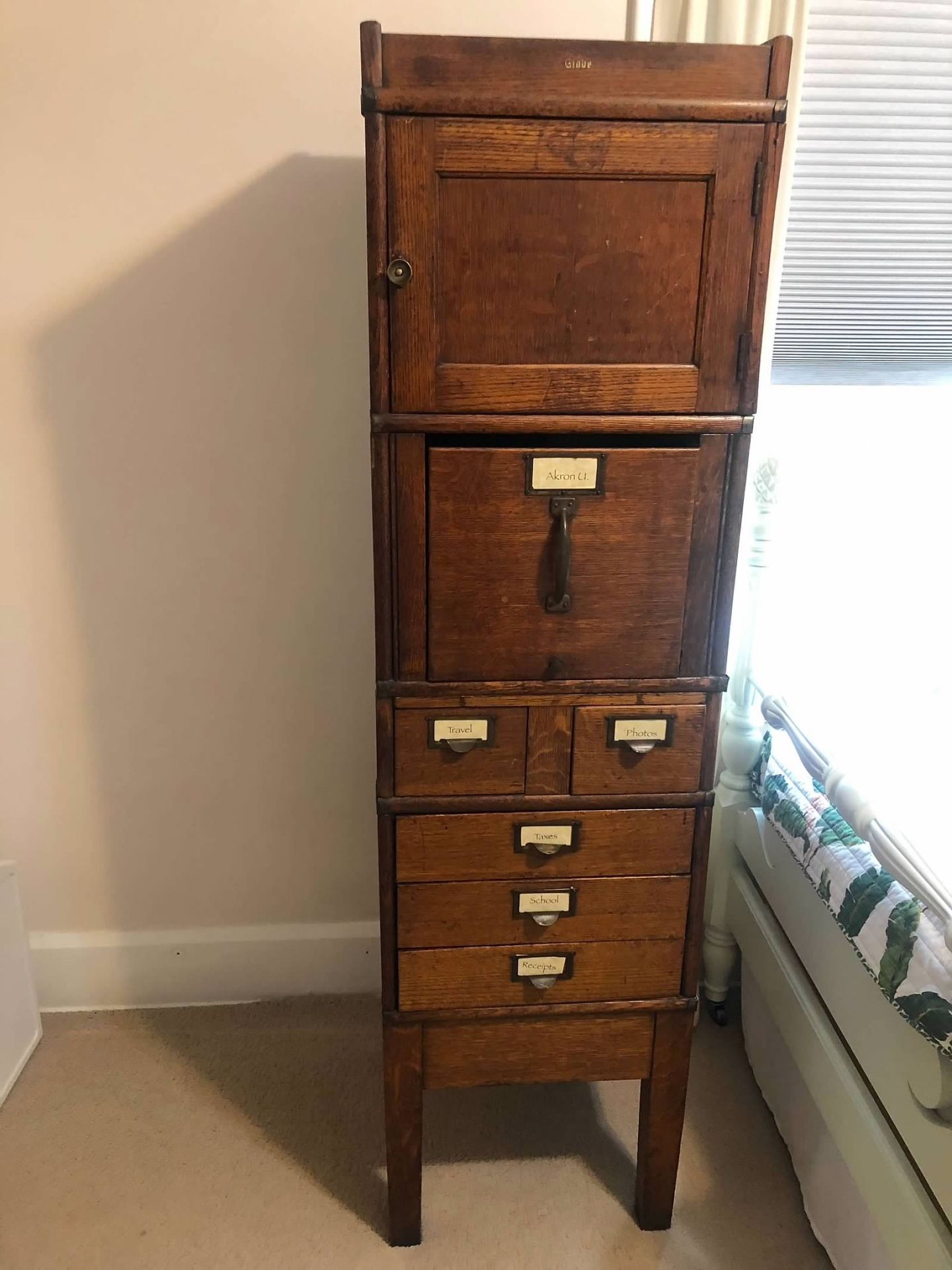 Vintage filing cabinet. Globe is manufacturer. This was my grandmothers filing cabinet in the 30’s and 40’s in her classroom. The pieces stack on top of each other so easy to assemble and move around.