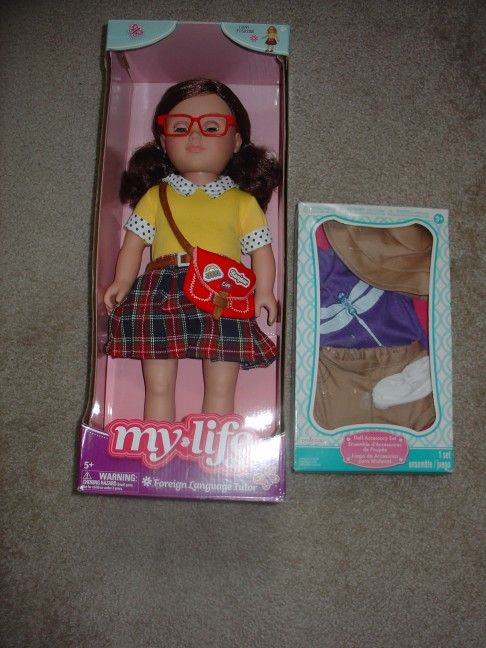NEW IN BOX WITH BONUS OUTFIT. SEE PHOTO FOR EXTRA OUTFIT IN BOX. My Life As 18-inch Poseable Foreign Language Tutor African American Fashion Doll Her dedication to learning and tutoring makes the My Life As 18” Poseable Foreign Language Tutor Doll the perfect study buddy for your curious child. This fully poseable doll has a soft torso, eyes that open and close, and brown hair that is so much fun to brush and style. This studious girl features a yellow top with contrast blue and white polka-dot printed collar and sleeves, a classic plaid skirt with a brown belt, a red book bag with foreign language patches, bold red glasses, and navy flats. As part of the full collection of My Life As dolls, the My Life As 18" Poseable Foreign Language Tutor Doll provides hours of playtime for any child and makes a wonderful Christmas, Hanukkah, holiday, or birthday present. Adorable foreign language tutor design Comes dressed in a top with polka dot collar and sleeve accents, plaid skirt, underwear, book bag, glasses, and flats One part of the entire "My Life As" doll collection Features a fully poseable, soft torso Fits most 18" clothing and accessories (additional clothing and accessories sold separately) Hair can be brushed and styled Eyes open and close Fully poseable 18" doll PVC surface may be wiped clean with a damp cloth, if needed Exclusive to Walmart Recommended for children ages 5 and up Warning: Choking hazard. Small parts. Not for children under 3 years. LOCATED IN HILLSBORO CASH ONLY I WILL NOT TEXT OR CALL, WILL ONLY REPLY TO MESSAGES. Makes a great gift.