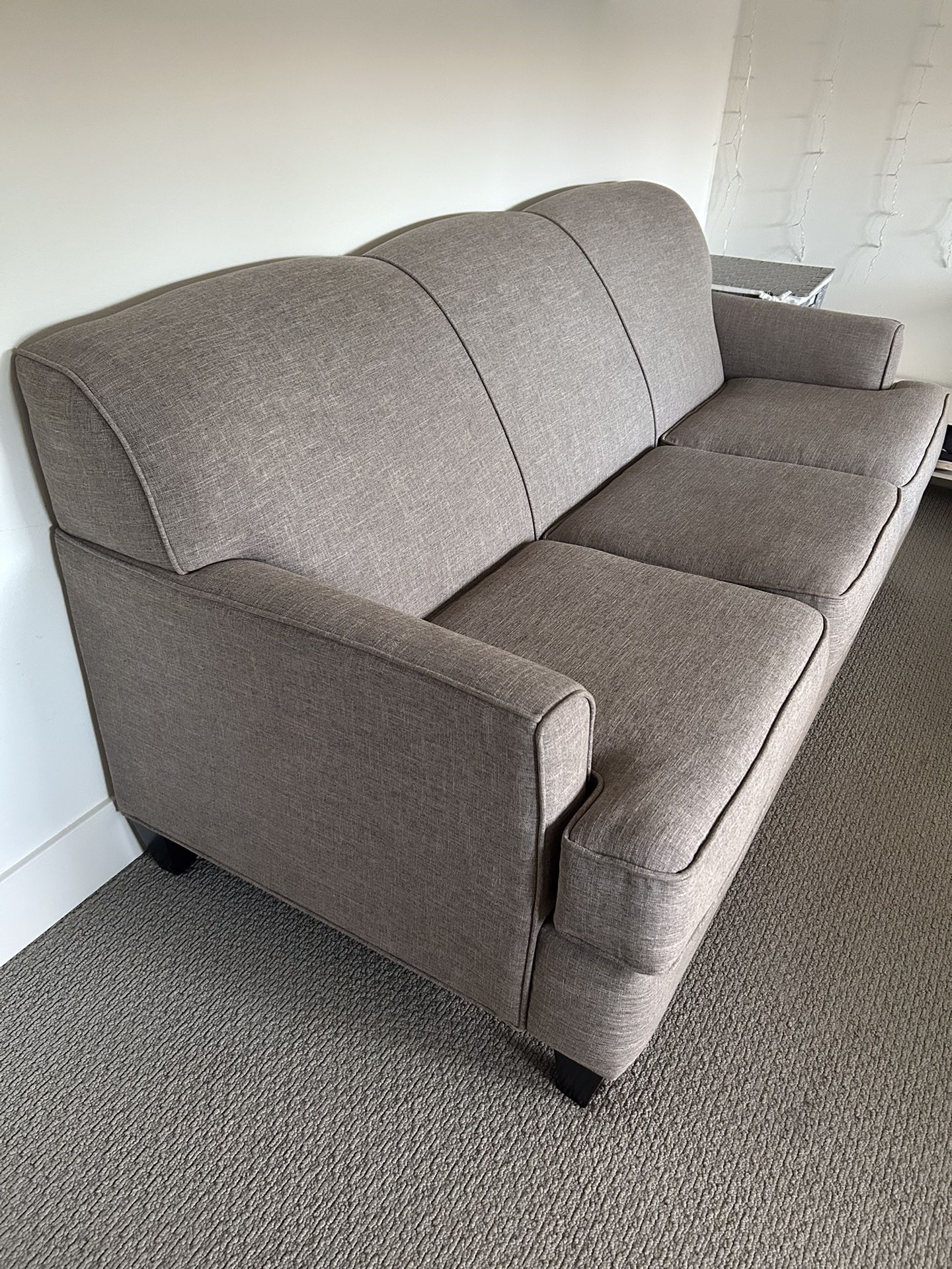Custom made gray sofa in like new excellent condition. Couch is 69” x 34” depth.