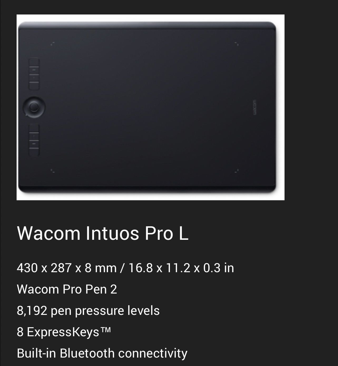 430 x 287 x 8 mm / 16.8 x 11.2 x 0.3 in Wacom Pro Pen 2 8,192 pen pressure levels 8 ExpressKeys™ Built-in Bluetooth connectivity