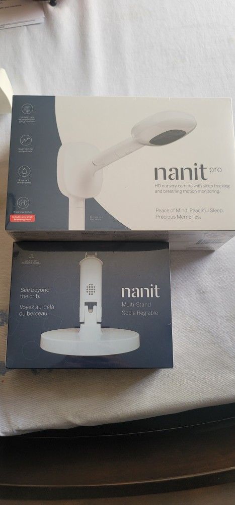 Have for sale a nanit Pro camera with a multi stand color white. Also comes with a crib size smart sheet, breathing band size 3 mnths-24 months, 6-9 month pebble grey pajama, 2 sleeping bags size 3-6 months and 6 -12 months, swaddle size 3-6 months, starter pack which includes swaddle size 0-3 and a breathing band size 0-3. You will be able to monitor baby's breathing, sleeping patterns watch him while baby sleeps and will be able to track and monitor baby's height and weight. This bundle is over $500 buy letting it go for $350 OBO. Everything is brand new still wrapped.