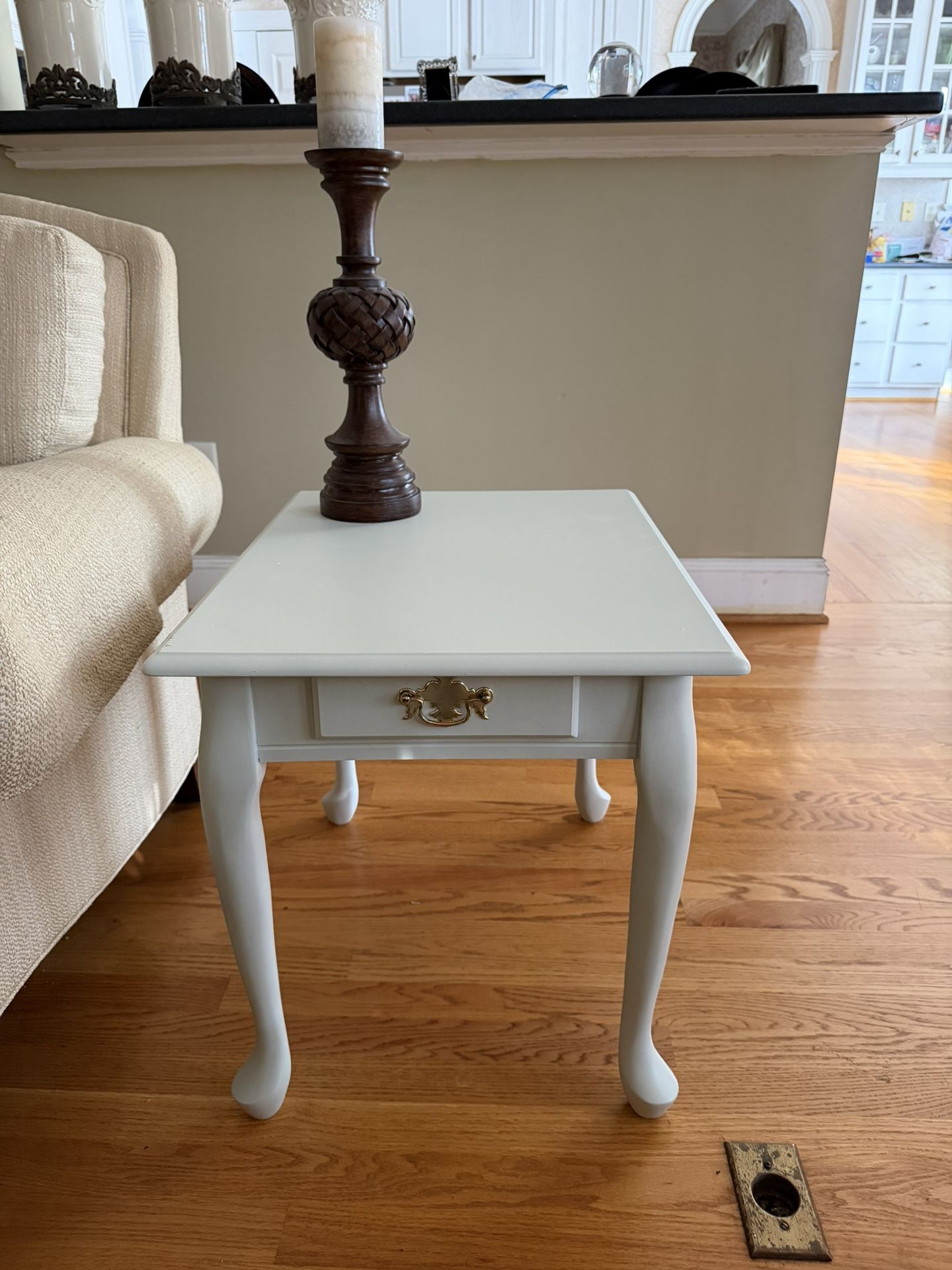 Beautiful white refurbished End Table/decorative table/ nightstand with functioning drawer. Measurements 19 inches width, 24 inches length, 21 inches high