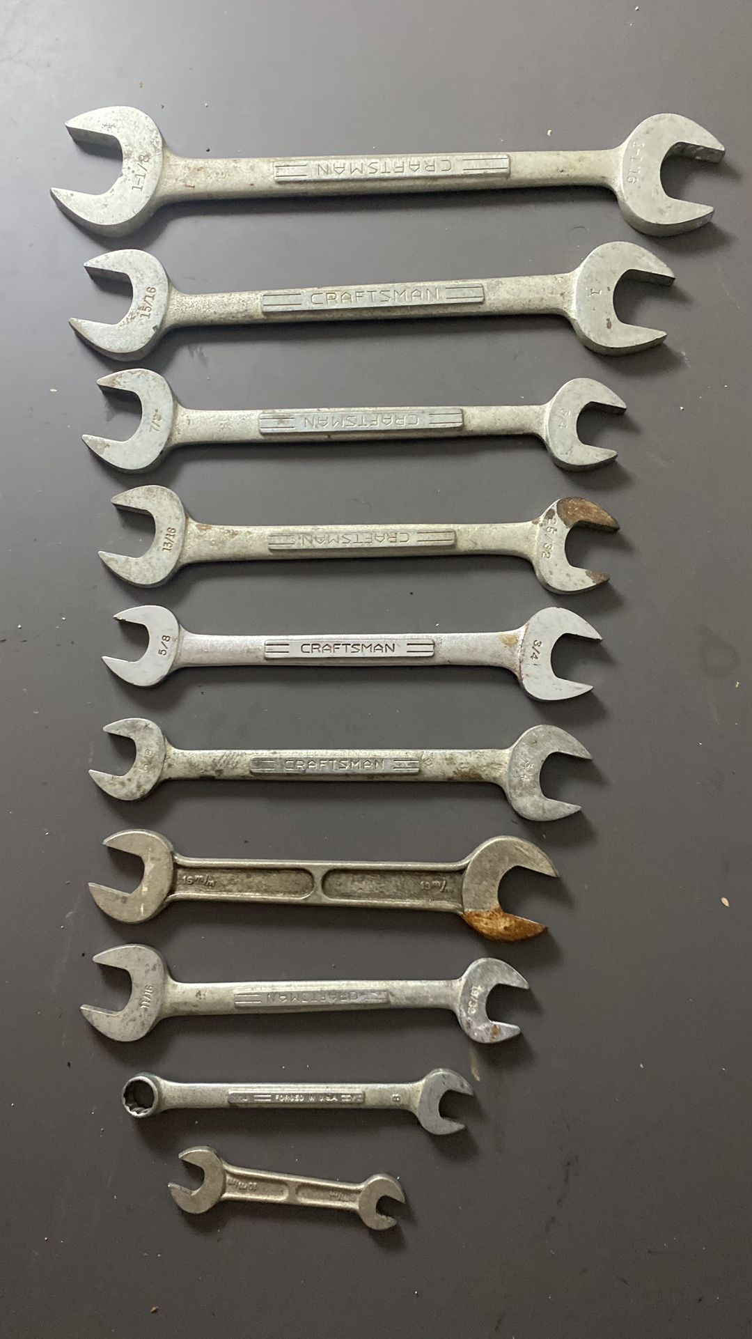 This vintage Craftsman wrench set includes 10 open-end wrenches, perfect for any mechanic or tool enthusiast. Made in the USA, these wrenches are crafted with durability and precision in mind. The sizes range from small to large, covering various needs for your projects. Wrench Sizes (from top to bottom): 1. 1-1/8" 2. 15/16" 3. 7/8" 4. 3/4" 5. 5/8" 6. 1/2" 7. 9/16" 8. 13/32" 9. 5/16" 10. 5/16" (double-ended)