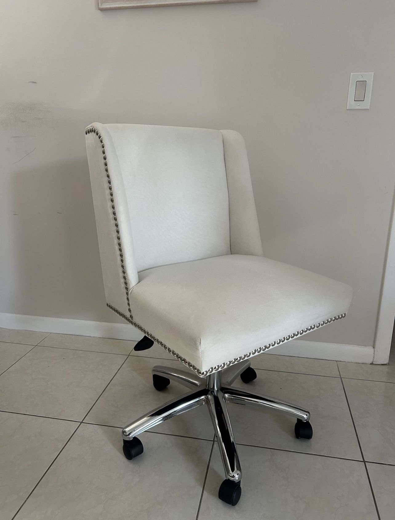 USED/LIKE NEW • ORIGINAL PRICE IS 200$ • PERFECT CONDITION • WHITE Description: B586C-WV Decorative Task Chair-White by Boss White Accent Chair is beautifully upholstered in Velvet fabric. It features a sleek, nail head trim. Upright locking position feature, provides comfortable back support.