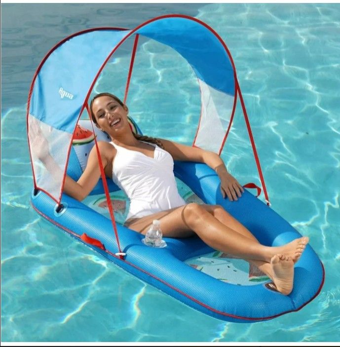 " We Ship ! Please contact us for a free discounted shipping quote ! Unfortunately we can not ship through Offer Up! " Only $59.95- (25% off!) List Price $39.95 See Images for more Details: Unwind in ultimate comfort with the Aqua Ultimate Sunshade Recliner Pool Lounge – Watermelon. This deluxe floating recliner features soft Cool Weave mesh fabric and oversized tubing to cradle your body with buoyant support. The removable UPF?50 canopy shields you from the sun, letting you recline in cool shade or soak up the rays when desired. Designed for maximum relaxation, the ergonomic headrest, built-in drink holder, and carry handles make this lounger as convenient as it is comfortable. Inflate quickly with the DuoLock valve system—two valves for fast fill and secure seal. Perfect for adults and teens 15?+, it supports up to 250?lbs and measures 60? x 36? when inflated. After each use, rinse with clean water, drain, wipe dry, and store in a ventilated, shaded area to prolong life and prevent mildew. Whether you're floating solo by the pool or drifting serenely on a lake, this vibrant watermelon lounger combines style with substance. UPC: 00(contact info removed) Shipping :