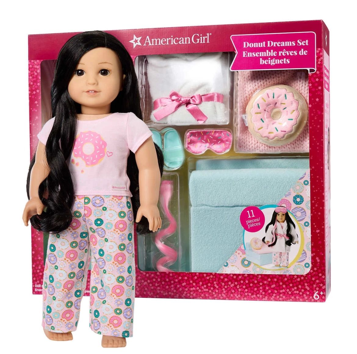 American Girl doll gift set Brown Eyes, Wavy Black-Brown Hair, Light Skin with Warm Olive Undertones (#5) Sweetest Slumber-Party Set A blue chair that flips out to a bed A cozy pink blanket A donut-shaped pillow with a frosting-and-sprinkles design A short-sleeved PJ top with a donut graphic Pajama pants with an allover donut print A soft white robe with a pink ribbon tie A pair of slippers An eye mask with a fun sprinkles design A pink hair extension that can be worn by both girls and dolls New. Small dent on top of box. See pictures Smoke and pet free home.