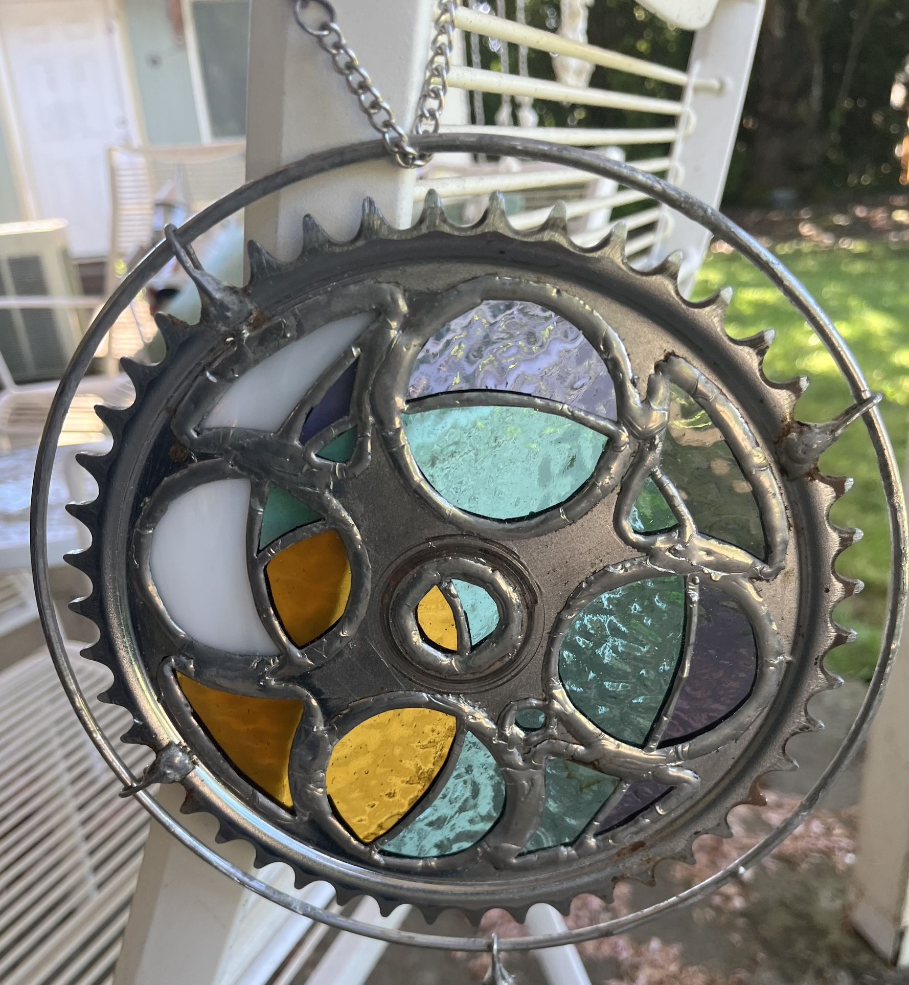 Beautiful Bike Spoke Stained Glass Art. Heavy. 8.5 “ Diameter. Green, mustard yellow, purple, white