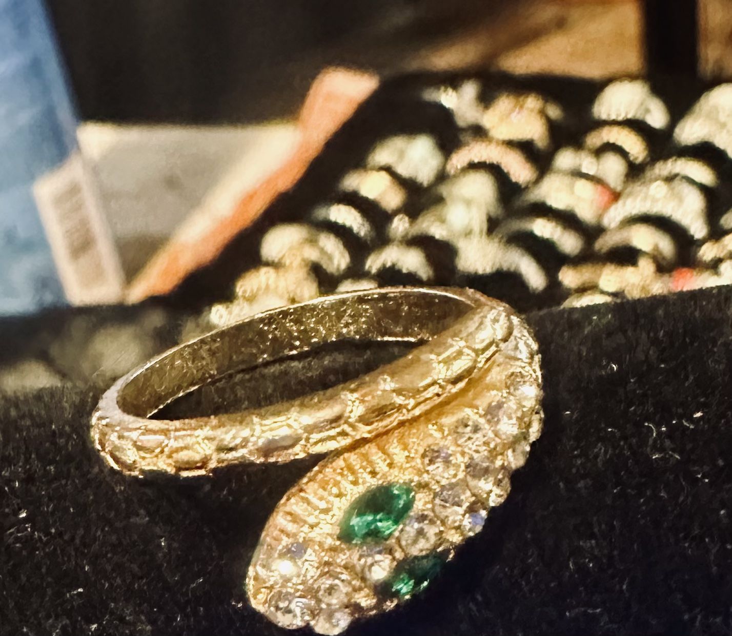 Beautiful snake ring with emerald colored eyes. Gold tone
