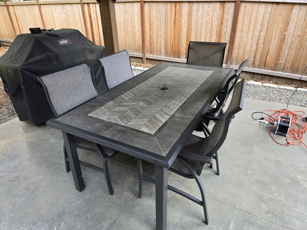 Outdoor patio dining table with hard tile surface 5 outdoor chairs Good condition Table size: 78x40