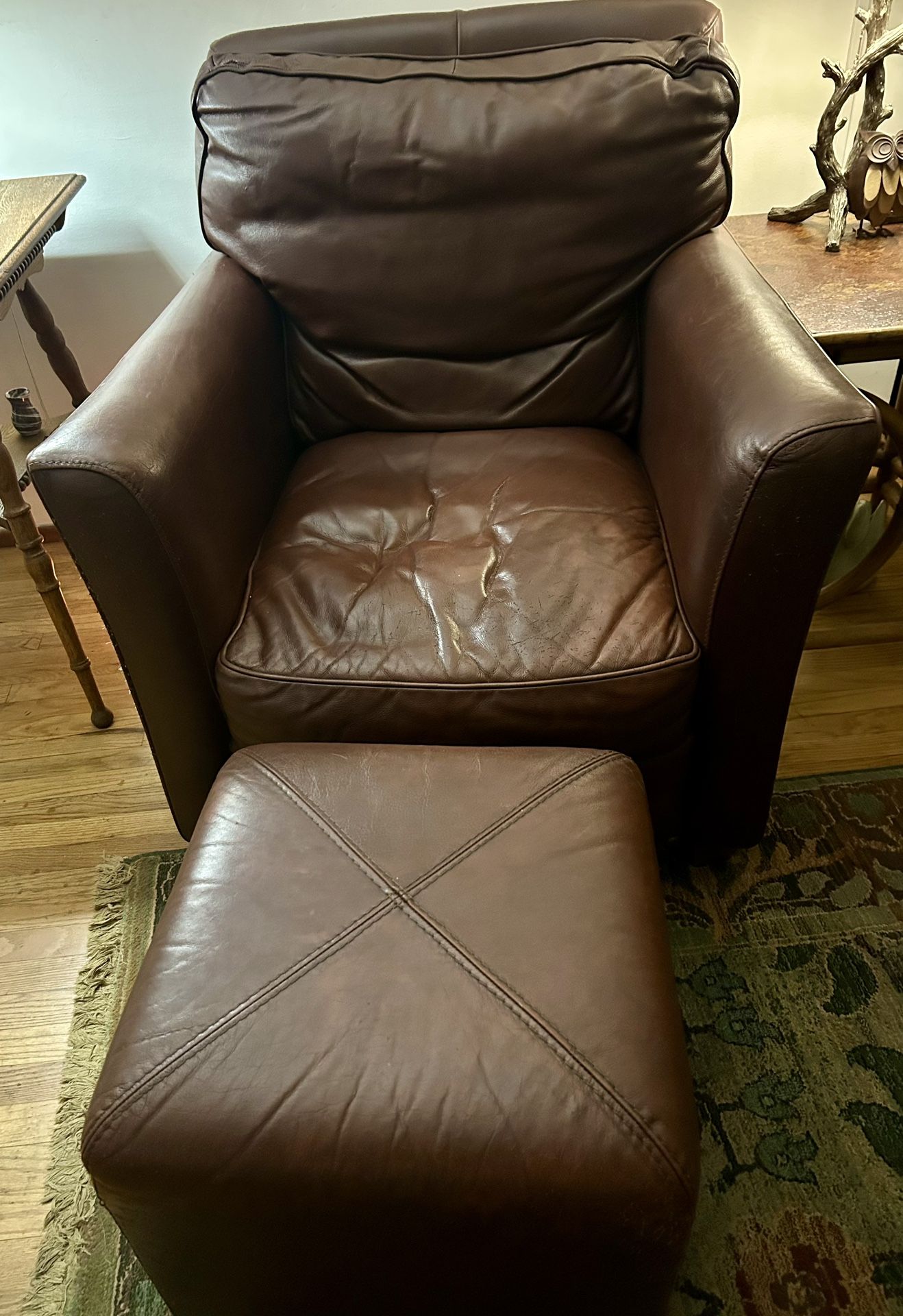 Faux leather brown Chair with Ottoman Chair 32”w 36” d 3’ h Ottoman 17x17” 18” h Accented w metal studs ‘AS IS’ scratches on side & back No tears Very comfortable