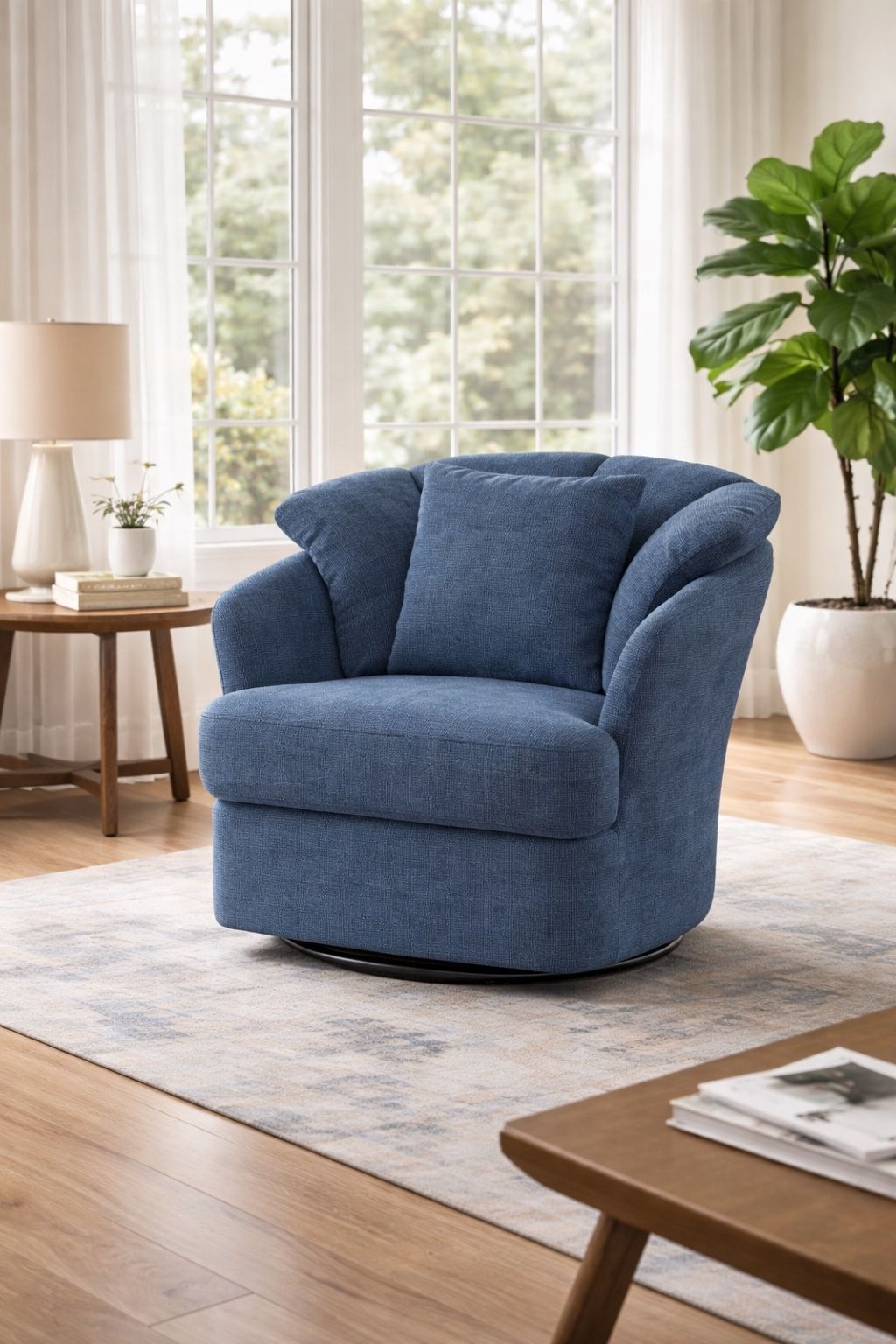 Metal Ring Barrel Chairs Mid Century Modern Fabric Accent Chairs, Blue. Swivel Barrel Chairs With Soft Padded Armrest, Oversized Swivel Chairs