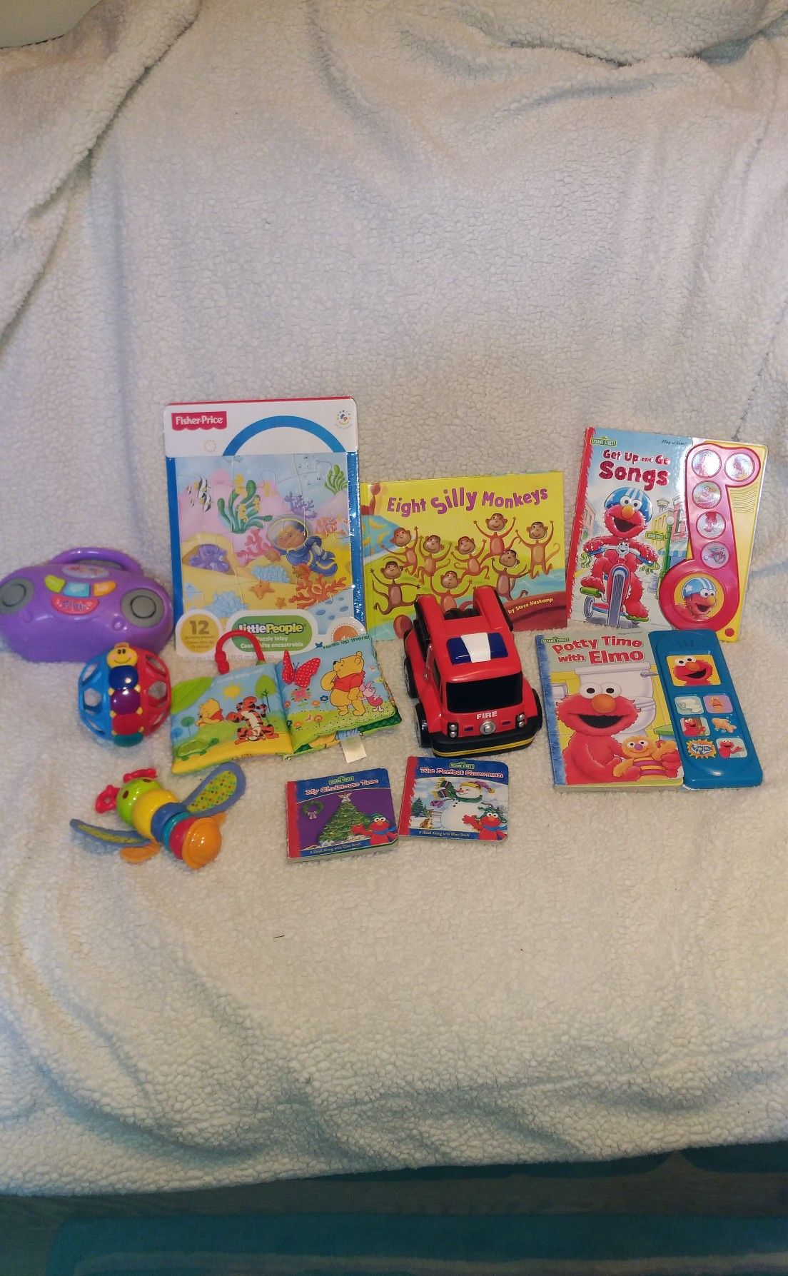 15 Baby toys, books, puzzle. Great for motor skill development and cause and effect learning. $15 Firm. Only $1 each. -2 Sesame Street Elmo musical books: Potty Time with Elmo and Get Up and Go Songs -New sealed Fisher Price puzzle -Musical radio -Roll along Fire truck -Bright Starts butterfly with sound -Texture gripping ball -Clip on Winnie the pooh cloth book -2 Sesame Street board books -Eight Silly Monkeys counting book -2 Rattles -Forest cloth book with loop -Bear with shapes Scroll down to see my other Offers OR on your mobile device Click the right arrow > next to my name and rating. Then click My Offers to see my other items.
