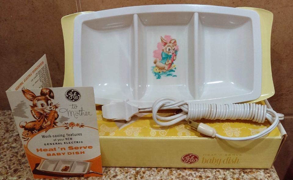 Vintage GE Heat ‘n Serve Baby Dish with rabbit design See entire description for more details. "General Electric" - “Model D2” - "Model No. BA2D2" - "Made In USA" 3 sections, each section can hold 4 ¾ oz. of baby food. with box, heats food quickly, with “How to Use Your General Electric Heat ‘N Serve Baby Dish” booklet, with cordset, suction cup does not stick well, box has a discolored spot and a crease, reflections in photograph. $20.00 (firm!) takes this vintage, baby dish home. - I do not respond to predefined (default) messages! Pick up in West Babylon.