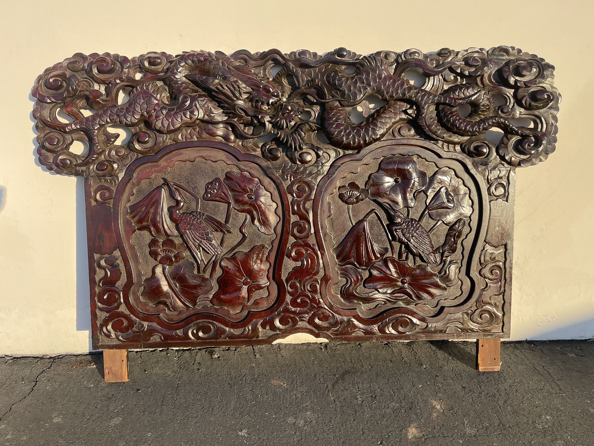 19th Century Antique Asian Wood Carved Dragon, Birds & Lotus Bench/Loveseat/Bed Panel