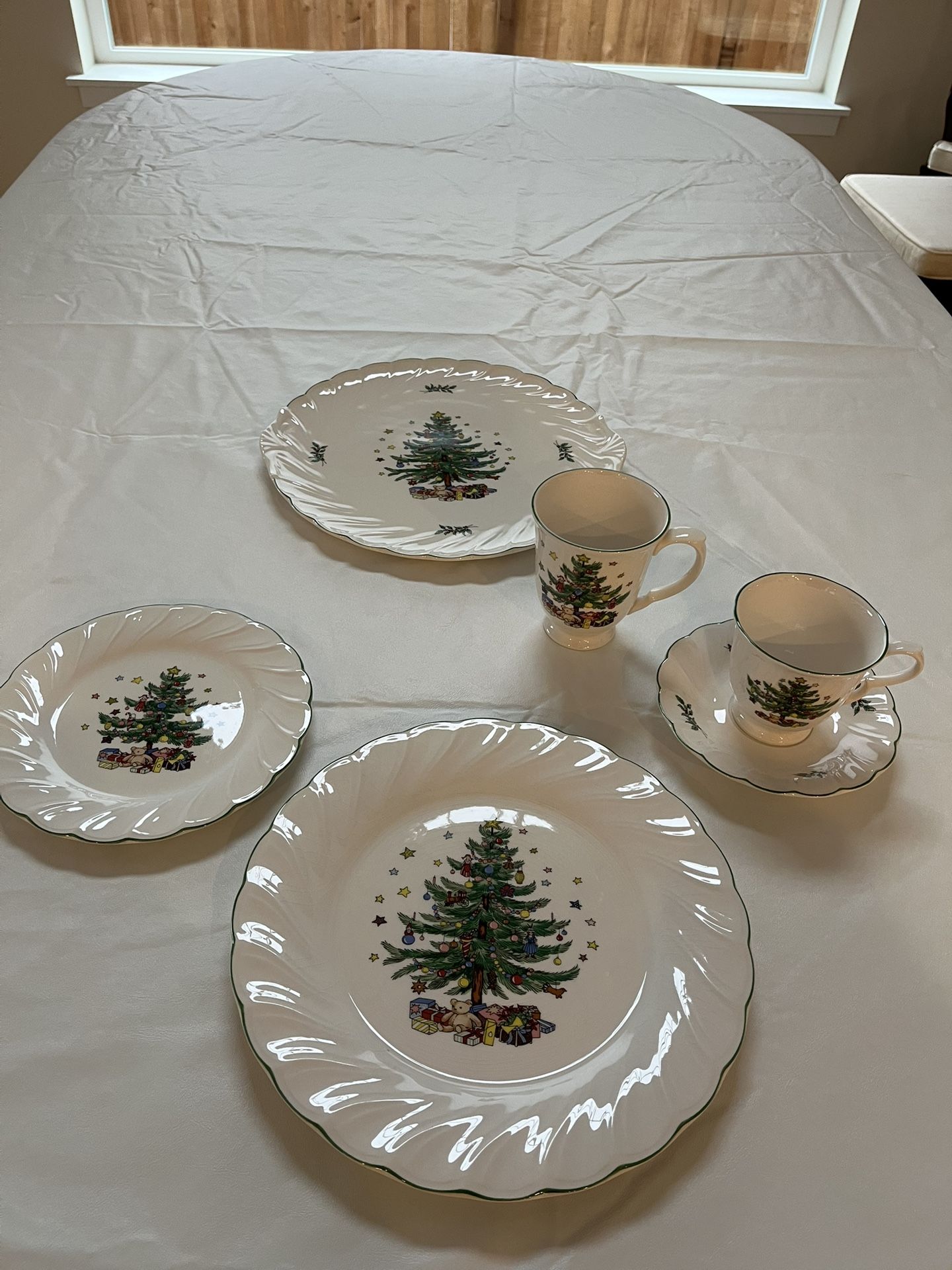 12 Happy Holidays place settings by Nikko, hand crafted in Japan. Each place setting includes a dinner plate, salad plate, a cup with saucer, and a mug for hot chocolate, apple cider, or cinnamon schnapps, etc. Included in my price are serving pieces, butter dish, salt & pepper shaker, creamer, serving bowls for vegetables, and other generously sized dish, plates, and one extra large platter for your main dish (i.e. prime rib or turkey). There are no chips on any of the dishes. Note the elegantly scalloped rim design and the cheery Christmas tree with presents, toys, and garlands. Dress it up as formal ware or dress it down for a casual event. Use table cloths, silverware/flatware, and center pieces for creativity. The dinnerware is oven safe, dishwasher safe, microwave safe.