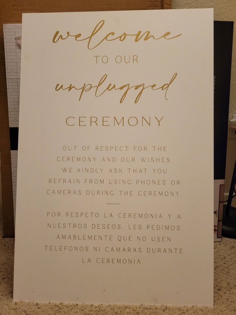 24x36 Acrylic White And Gold Unplugged Ceremony Spanish/English Sign.