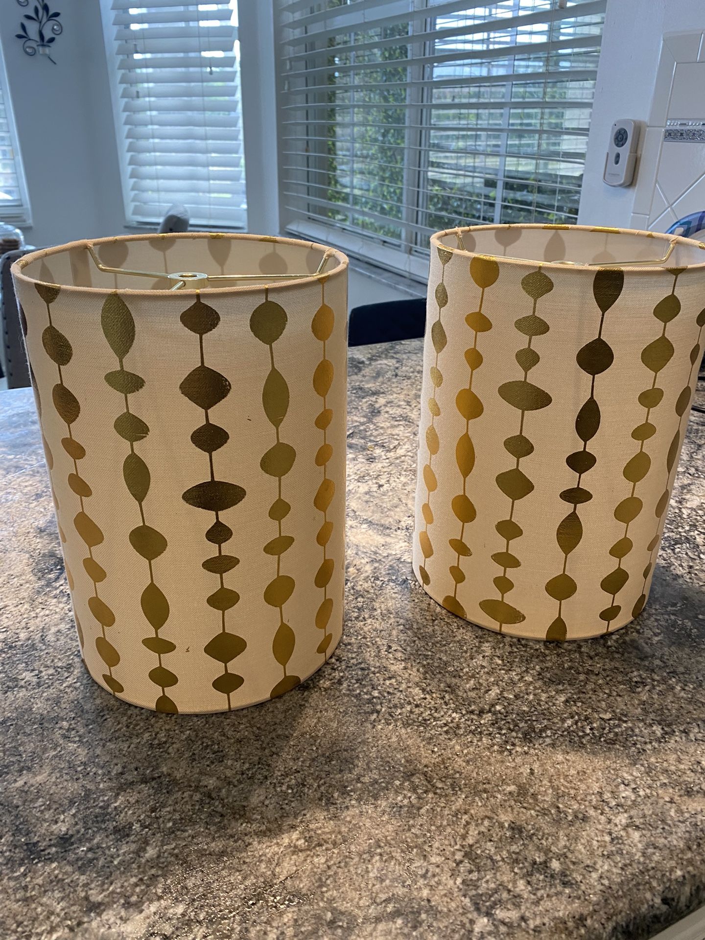 Beige and gold lamp shades (2). 8” width and 11” height. Really beautiful! New condition