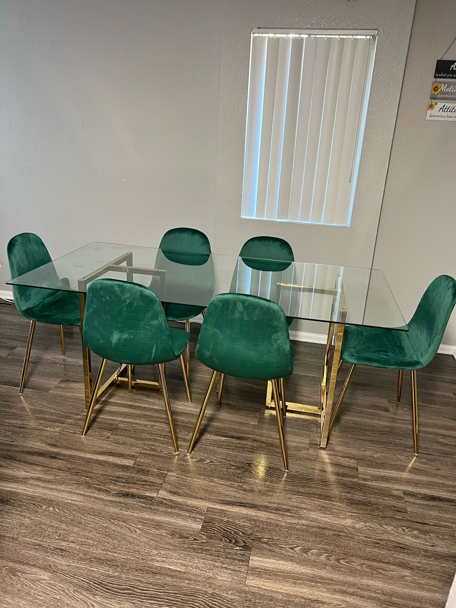 New in the box - 71”x35” dining table - Tempered glass top - Gold chrome legs - 6 velvet chairs (or pick another color 6 options) - Perfect for big families - Sturdy rectangular kitchen table - Modern style similar to West Elm or CB2 furniture Table Dimension 71” x 35” x 30” (W x D x H) You can pick up or delivery is available for extra fee.