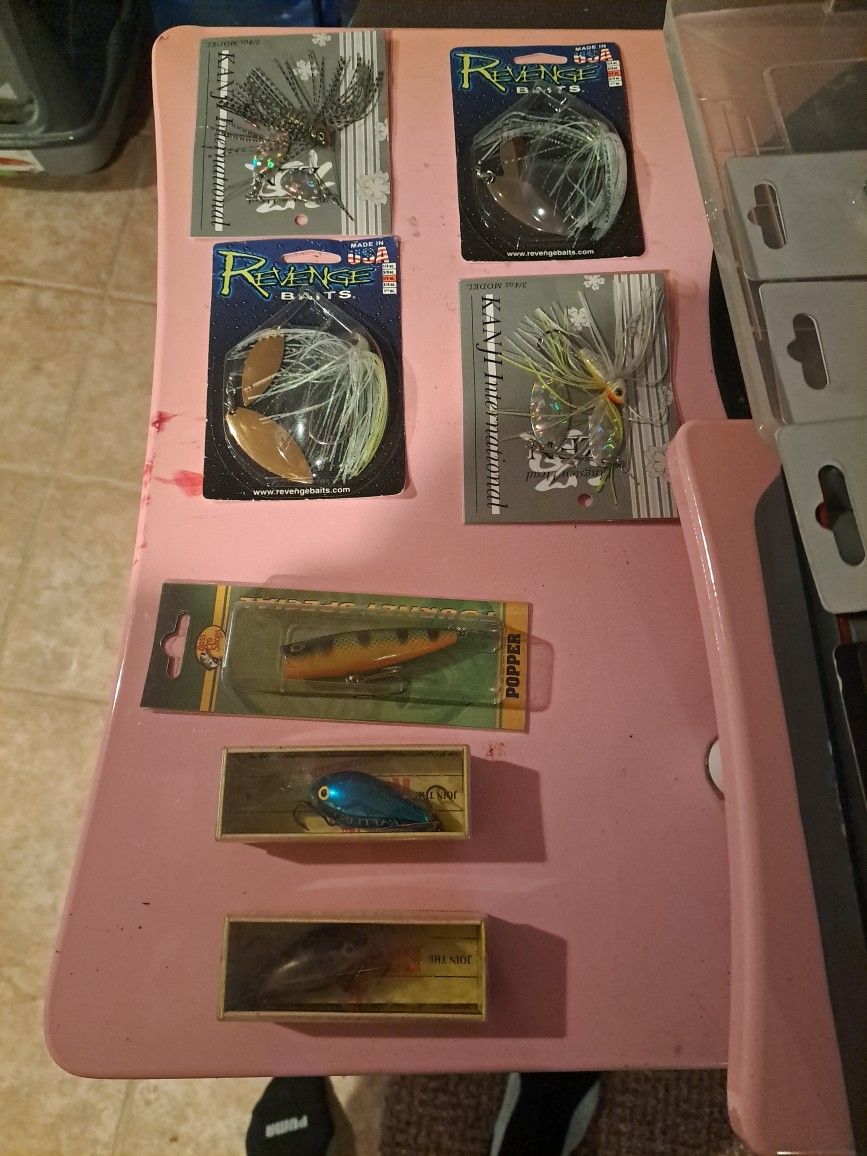 I have Rapala , Bass Pro Shops, Revenge spinners, Gary Yamamoto soft pairs, Zoom, Z-Man, weights, hooks. Over 50 bags of soft baits and 17 lures. Hooks, weights, and many brand new parts for spinning reels. Everything for $149. 99