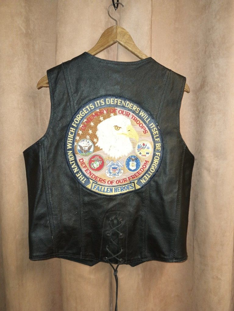 This is a men's black leather fallen heroes vest, W/ 5 patches in the front, including the word hammer, & and the large fallen heroes patch on the back in good condition snap closure Chest 21 in Length 24 in Pick up in Seffner 33584