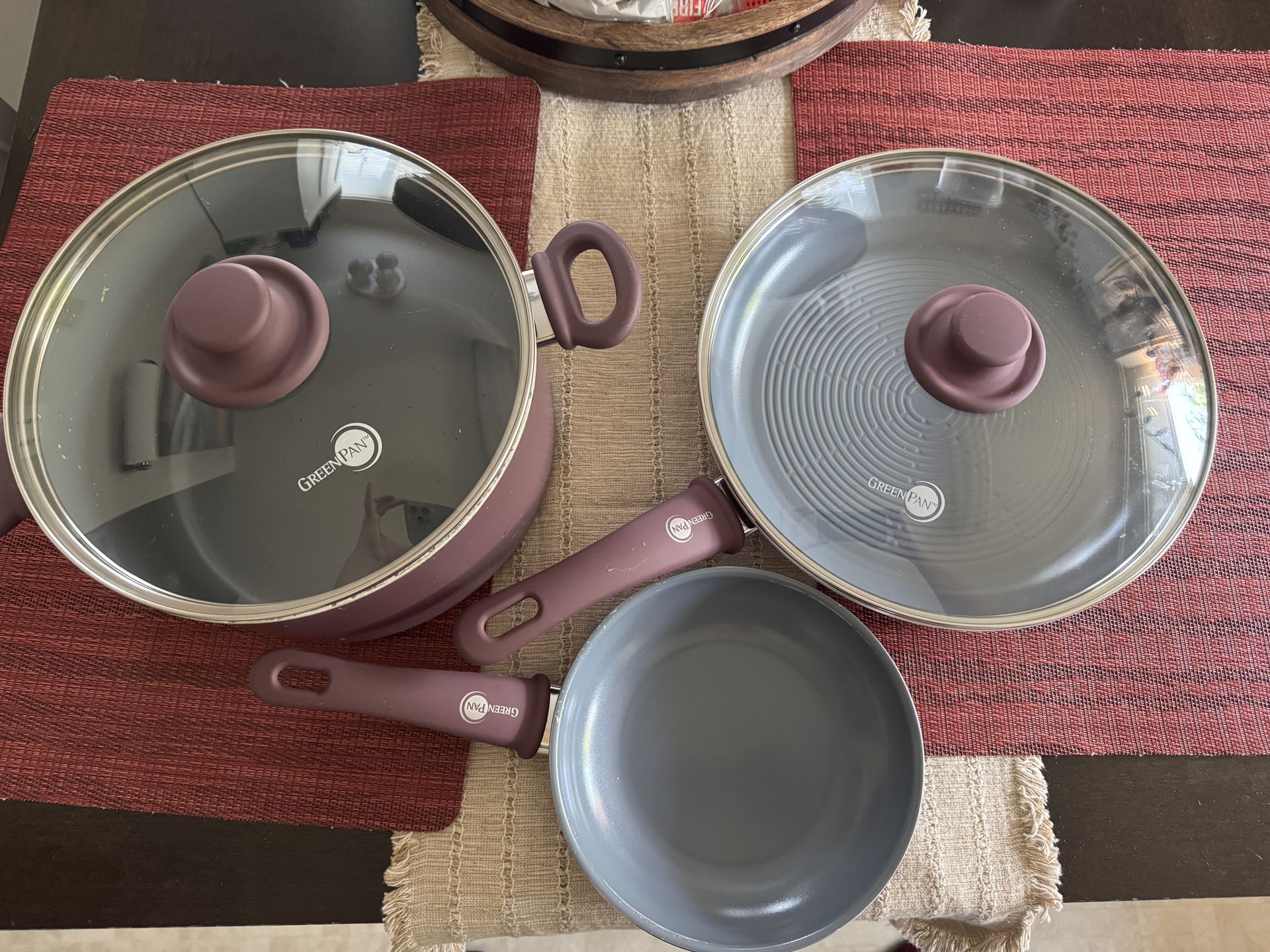 This 5 piece set is dishwasher safe and safe for all stovetops - gas, electric, induction, glass, ceramic, etc. Oven safe up to 600°, the lids are oven safe up to 425°. The set includes: - [ ] 11” grill fry pan/skillet with tempered glass lid. This pan has raised ridges on the bottom - it’s great to sear, sauté, fry, etc. This is brand new, never used. There are some scratches on the outside edges because of the way the pans were stored. - [ ] 7” fry pan/skillet. This is brand new, never used. There are some scratches on the outside edges because of the way the pans were stored. - [ ] 6 quart stock pot with tempered glass lid. This is used and does contain some scratches and pits from being used and stored. It’s still totally usable and I never have any problems with any food sticking to it (and I used it all the time). The bottom is also pretty scratched up (paint coming off) from being slid around on the burner), but I haven’t noticed it causing any problems. I love this set but I’m selling these only because I was gifted a new set. Smoke free home.