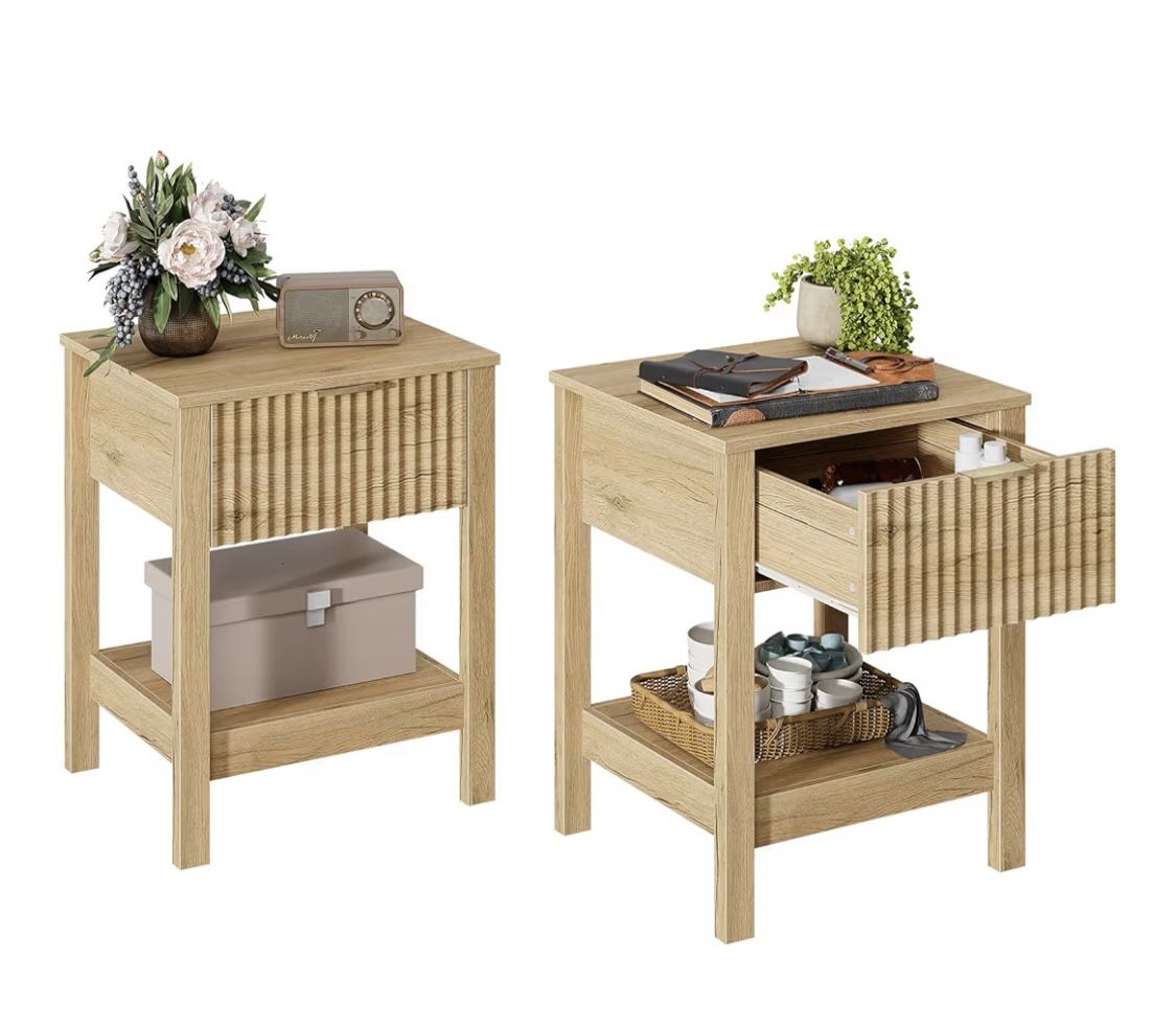 Fluted nightstand with gold handle, set of 2 mid-century nightstands with drawer, bedside table with storage shelf, large side tables for living room