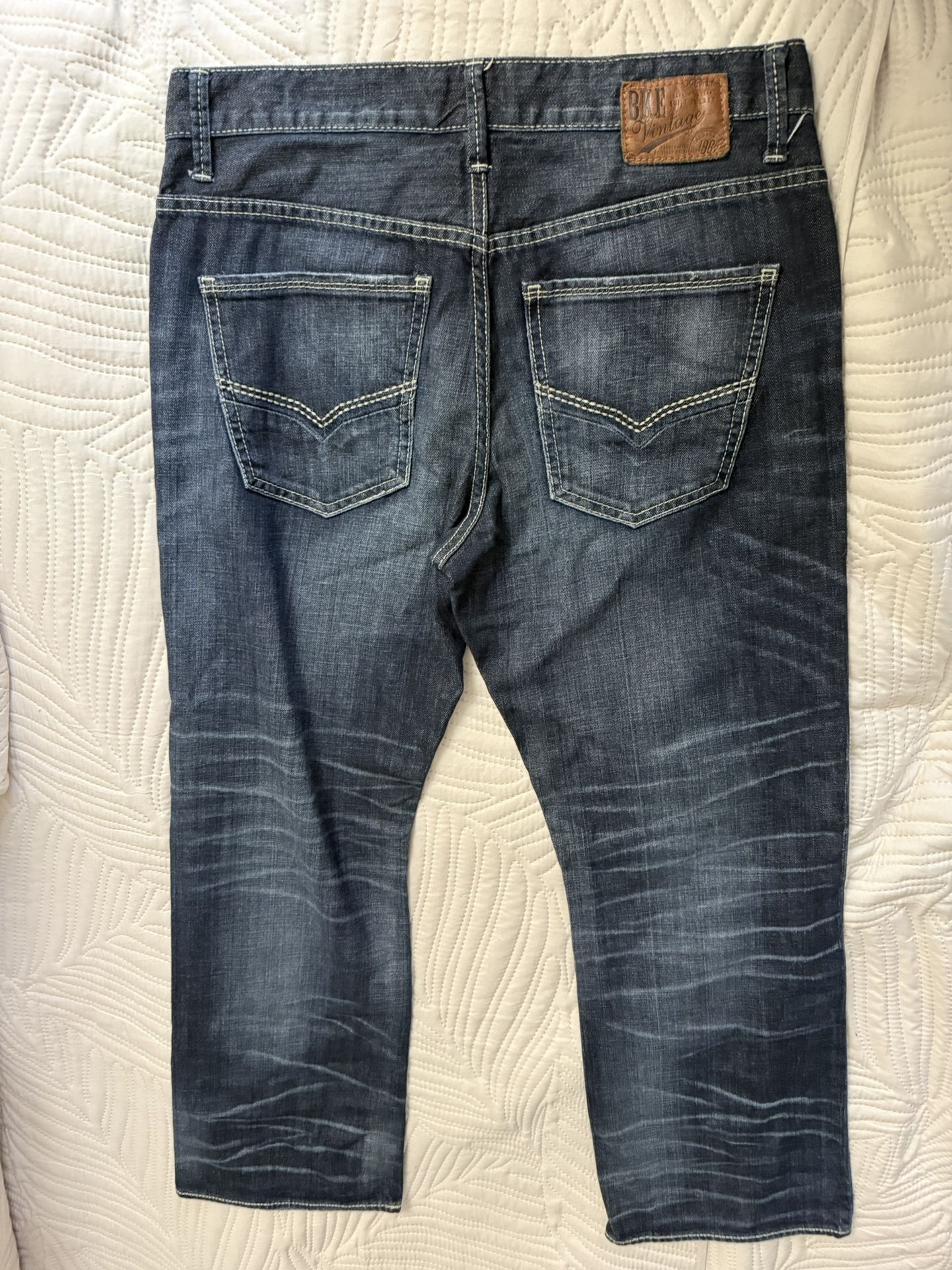 BKE Vintage Welder men's jeans. Size: 32R (approx 32x32). Material: 99% Cotton 1% Elastane Dark wash denim with fading and whiskering. Classic straight fit with slight stretch. Approx measurements: Waist: about 32 inches Inseam: about 32 inches Pre-owned condition with normal wear. Please see photos for measurements and condition.