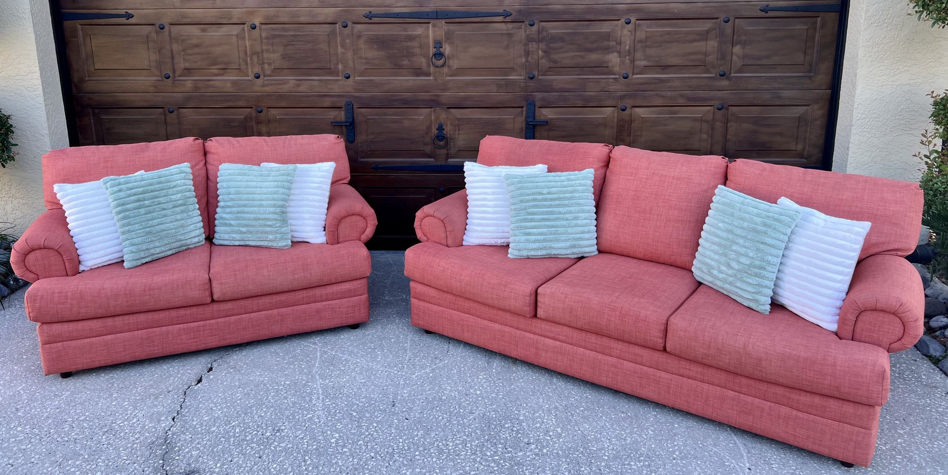 🔸Selling this beautiful Coral color Sofa & Loveseat Set 🔸very good condition 🔸very comfortable 🔸comes from a pet & smoke free home 🔸 Measurements are; Sofa 77” x 35” Loveseat 55” x 35” 🔸asking price $395 🚚delivery available for an extra fee 📍location is in Oviedo 🗣️hablamos español ✨accent pillows not included✨