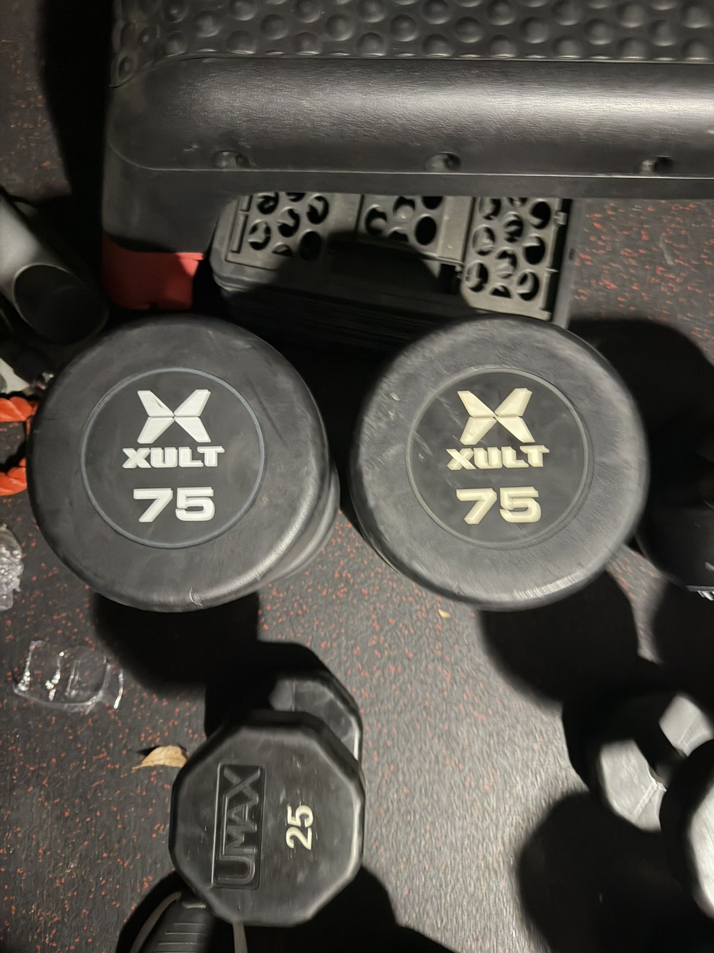 Used pair of xult brand gym quality dumbbells. In good shape, only missing decal on one side as pictured. 75lb pair