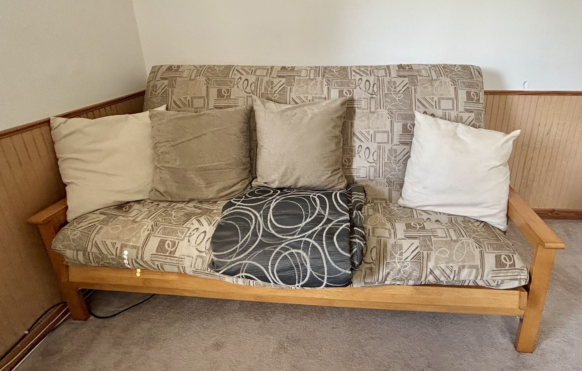 135.00 or best offer Wood frame futon like new condition from a smoke free home. 79” long Comes with 2 covers and 4 throw pillows.