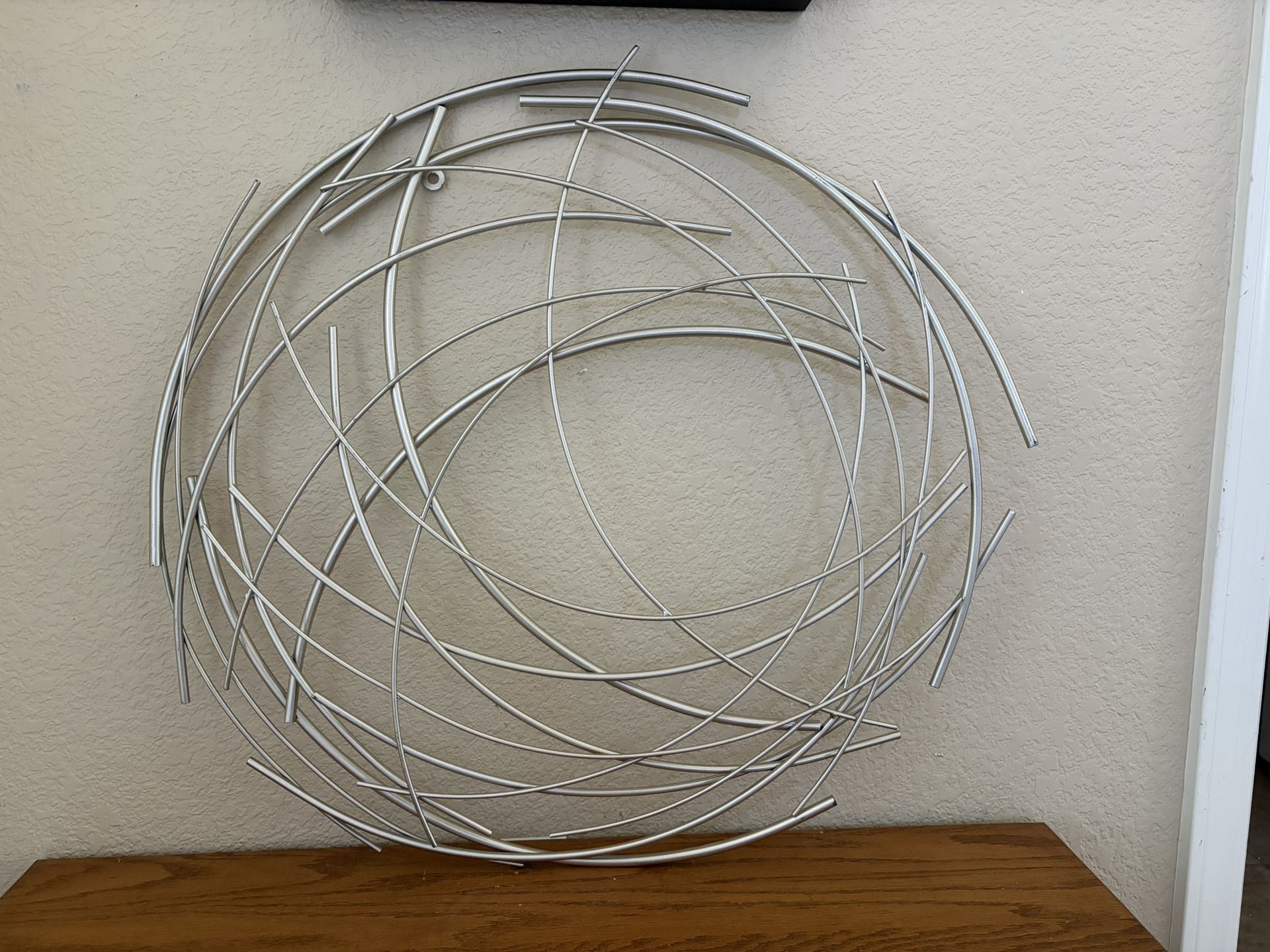 This contemporary wall art is made from metal tubes in an intricate swirl pattern. It has a nice sleek silver finish. It is 25” diameter. Using your imagination, think of it as the sky, earth or a gust of wind. Perfect as a housewarming gift, business gift or holiday gift. Beautiful hung in living room, bedrooms, study rooms, offices, waiting areas, corridors. Easy hang keyhole hook on back. Crossroads are Power & Queen Creek Rds. Porch pickup anytime.